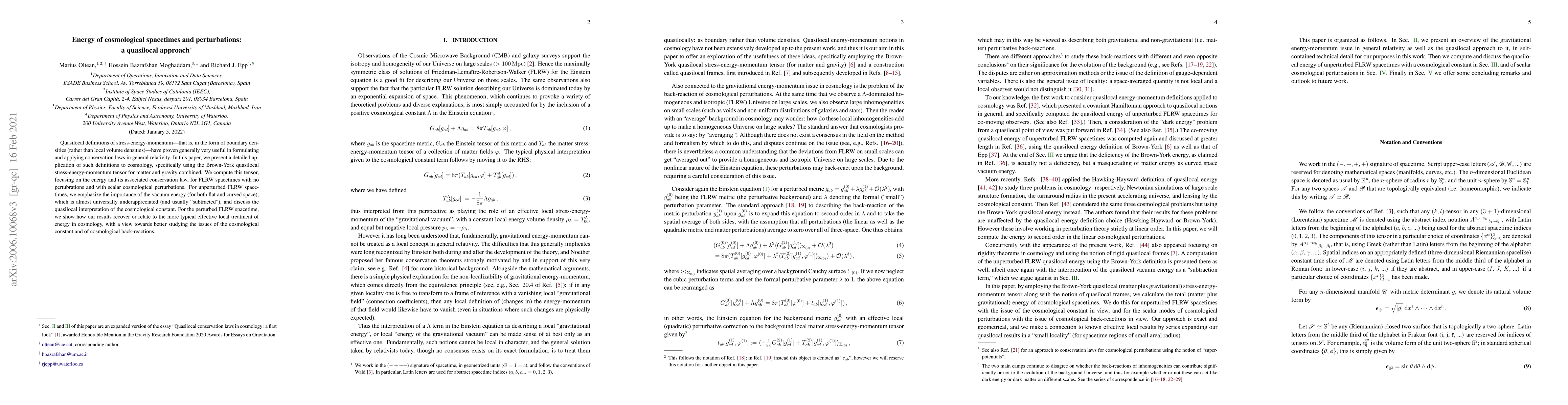 This paper applies quasilocal stress-energy-momentum tensors to cosmology, focusing on the energy of FLRW spacetimes both unperturbed and with scalar perturbations. The study highlights the significance of vacuum energy in unperturbed FLRW models and discusses the implications for the cosmological constant and back-reactions.