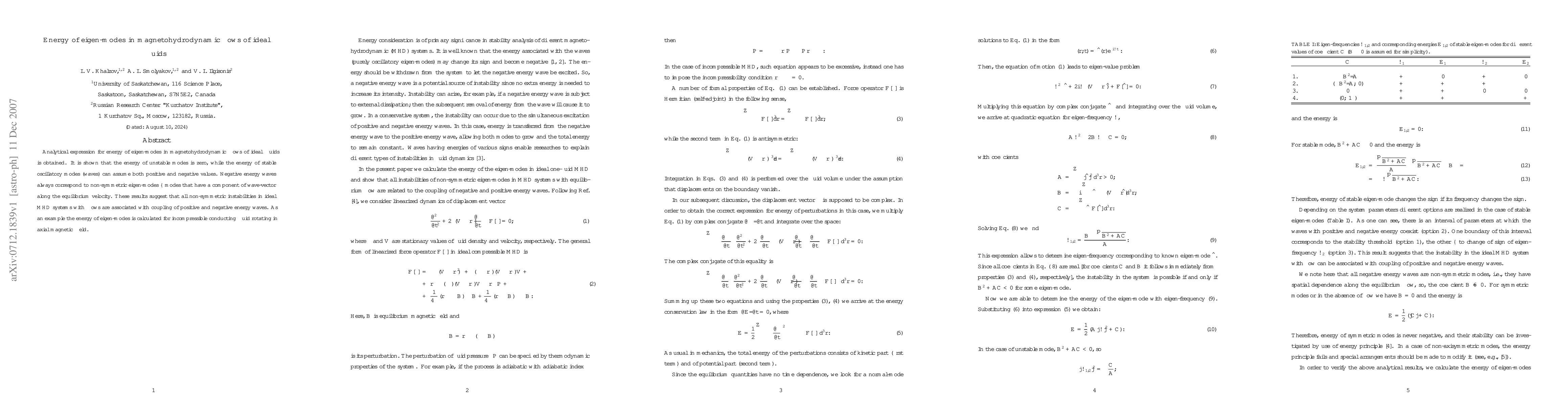 This paper derives an analytical expression for the energy of eigen-modes in magnetohydrodynamic flows of ideal fluids, revealing that unstable modes have zero energy while stable oscillatory modes can have positive or negative energy. Negative energy is linked to non-symmetric eigen-modes, suggesting a coupling mechanism for instabilities in ideal MHD systems. An example calculation is provided for an incompressible conducting fluid rotating in an axial magnetic field.