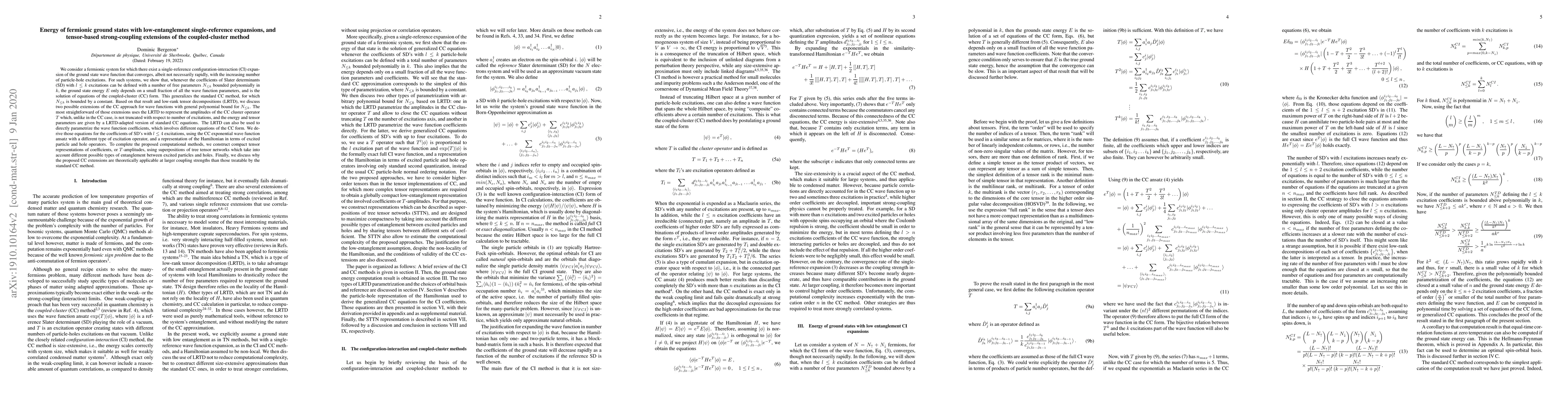 We consider a fermionic system for which there exist a single-reference configuration-interaction (CI) expansion of the ground state wave function that converges, albeit not necessarily rapidly, with respect to excitation number. We show that, if the coefficients of Slater determinants (SD) with $l\leq k$ excitations can be defined with a number of free parameters $N_{\leq k}$ bounded polynomially in $k$, the ground state energy $E$ only depends on a small fraction of all the wave function parameters, and is the solution of equations of the coupled-cluster (CC) form. This generalizes the standard CC method, for which $N_{\leq k}$ is bounded by a constant. Based on that result and low-rank tensor decompositions (LRTD), we discuss two possible extensions of the CC approach for wave functions with general polynomial bound for $N_{\leq k}$. First, one can use LRTD to represent the amplitudes of the CC cluster operator $T$ which, unlike in the CC case, is not truncated with respect to excitation number, and the energy and tensor parameters are given by a LRTD-adapted version of standard CC equations. Second, the LRTD can also be used to directly parametrize the CI coefficients, which involves different equations of the CC form. We derive those equations for up to quadruple-excitation coefficients, using a different type of excitation operator in the CC wave function ansatz, and a Hamiltonian representation in terms of excited particle and hole operators. We complete the proposed CC extensions by constructing compact tensor representations of coefficients, or $T$-amplitudes, using superpositions of tree tensor networks which take into account different possible types of entanglement between excited particles and holes. Finally, we discuss why the proposed extensions are theoretically applicable at larger coupling strengths than those treatable by the standard CC method.