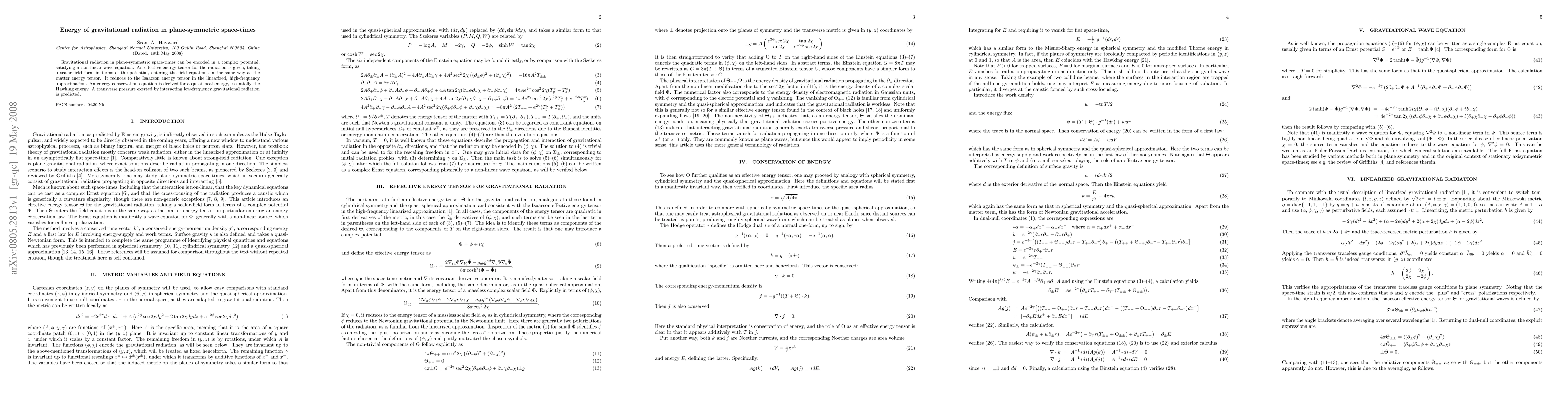 This paper presents an effective energy tensor for gravitational radiation in plane-symmetric space-times, encoded in a complex potential that satisfies a non-linear wave equation. It derives an energy conservation equation for quasi-local energy, akin to the Hawking energy, and predicts a transverse pressure from interacting low-frequency gravitational radiation.