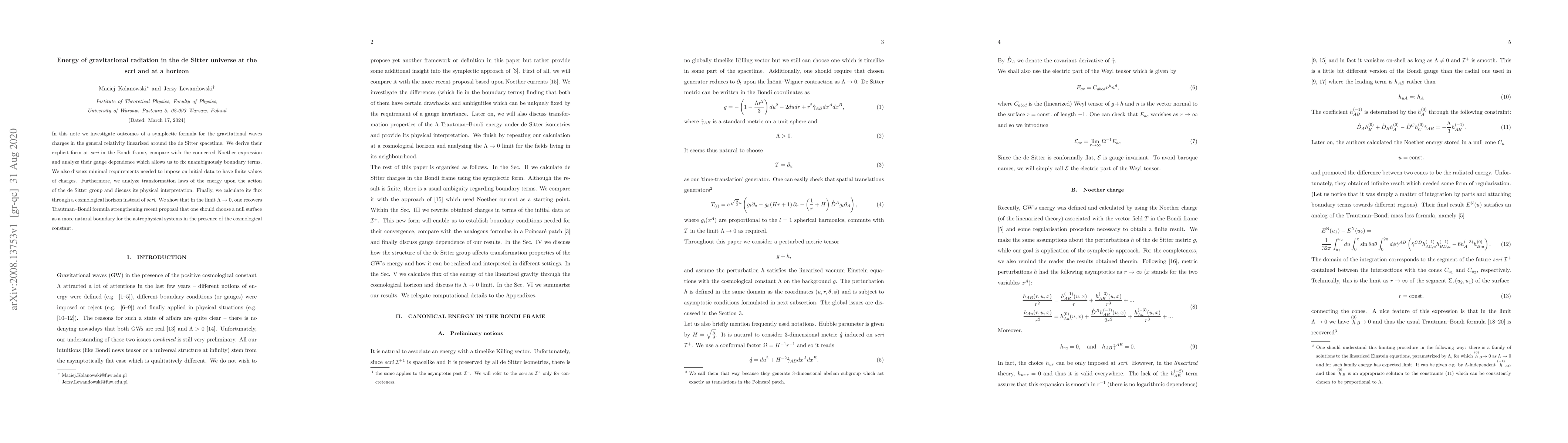 In this note we investigate outcomes of a symplectic formula for the gravitational waves charges in the general relativity linearized around the de Sitter spacetime. We derive their explicit form at {\it scri} in the Bondi frame, compare with the connected Noether expression and analyze their gauge dependence which allows us to fix unambiguously boundary terms. We also discuss minimal requirements needed to impose on initial data to have finite values of charges. Furthermore, we analyze transformation laws of the energy upon the action of the de Sitter group and discuss its physical interpretation. Finally, we calculate its flux through a cosmological horizon instead of {\it scri}. We show that in the limit $\Lambda \to 0$, one recovers Trautman--Bondi formula strengthening recent proposal that one should choose a~null surface as a more natural boundary for the astrophysical systems in the presence of the cosmological constant.