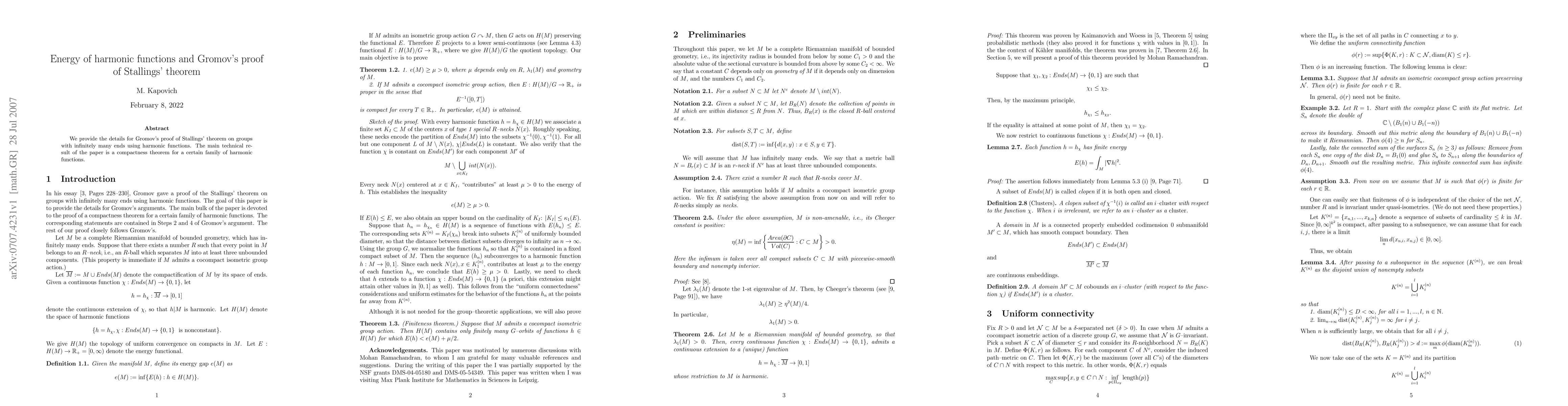 The paper provides a detailed analysis of Gromov's proof of Stallings' theorem on groups with infinitely many ends, focusing on harmonic functions and their energy.