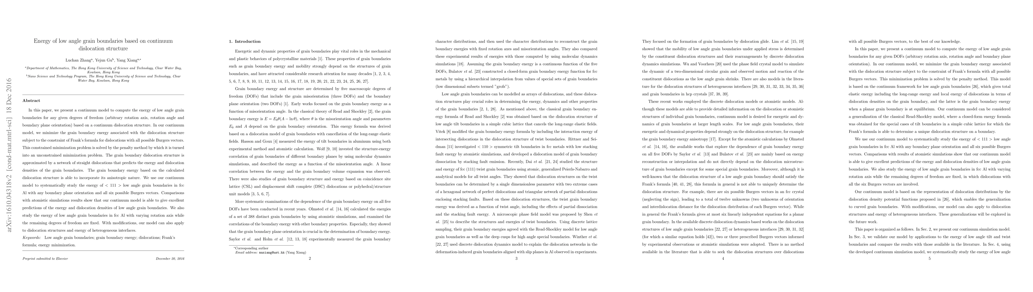 This paper proposes a continuum model for computing the energy of low angle grain boundaries using a dislocation network approach, which accurately predicts energy and dislocation densities. The model's effectiveness is validated through comparisons with atomistic simulations for fcc Al, showing excellent agreement.
