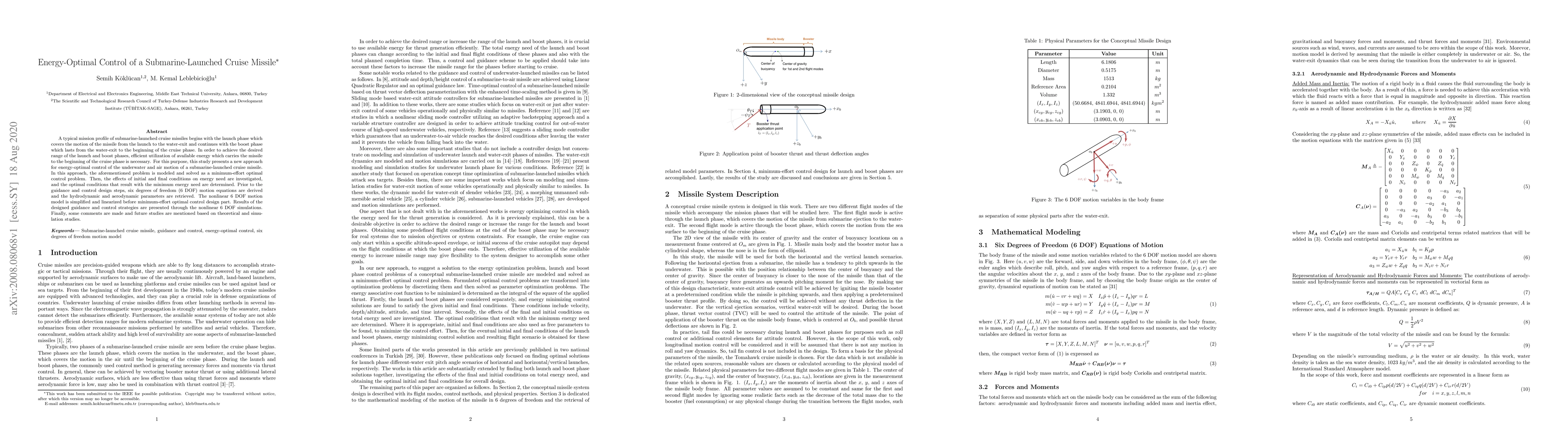 This paper presents a new method for energy-optimal control of a submarine-launched cruise missile, focusing on minimizing energy use during the launch and boost phases. The study derives a 6 DOF motion model, simplifies it, and designs optimal control strategies based on minimum-effort principles, validated through nonlinear simulations.