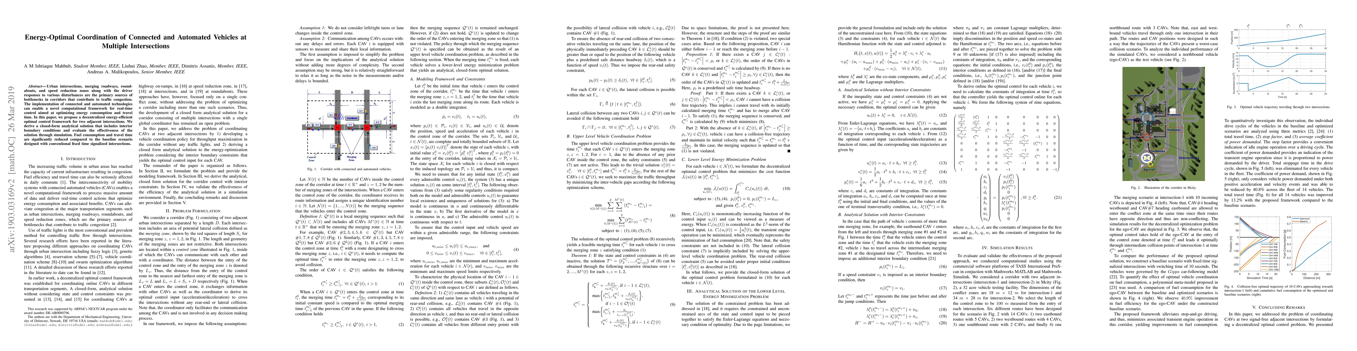 This paper proposes a decentralized framework for optimizing energy consumption and travel time at two adjacent intersections using connected and automated vehicle technologies. The authors derive a closed-form analytical solution and demonstrate significant reductions in fuel consumption and travel time compared to conventional intersections.