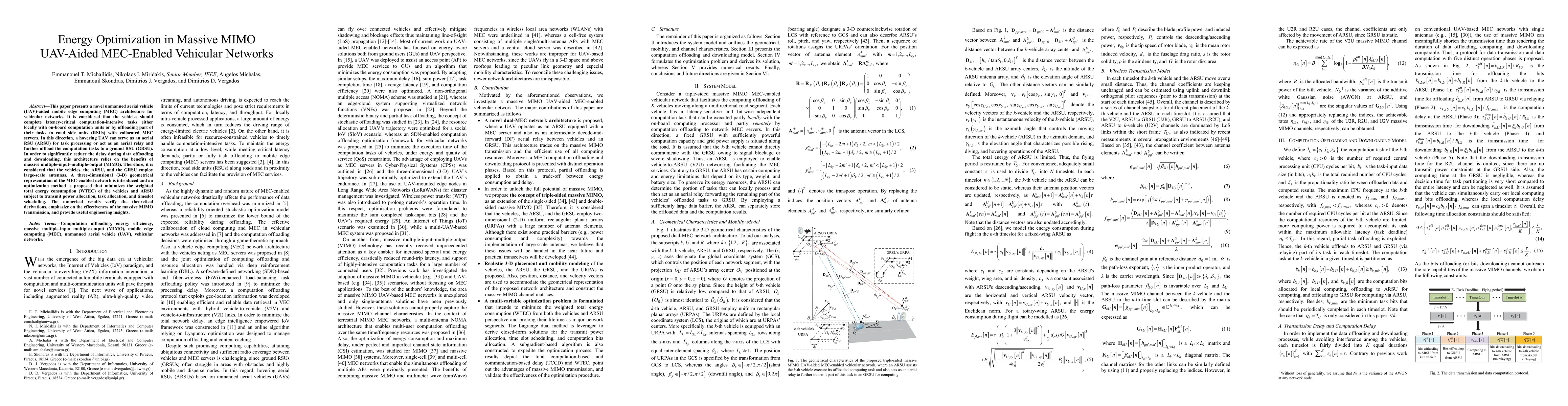 This paper proposes a UAV-aided MEC architecture for vehicular networks, utilizing massive MIMO to reduce latency in task offloading. An optimization method minimizes total energy consumption, considering power, task allocation, and scheduling, with numerical results validating the approach.