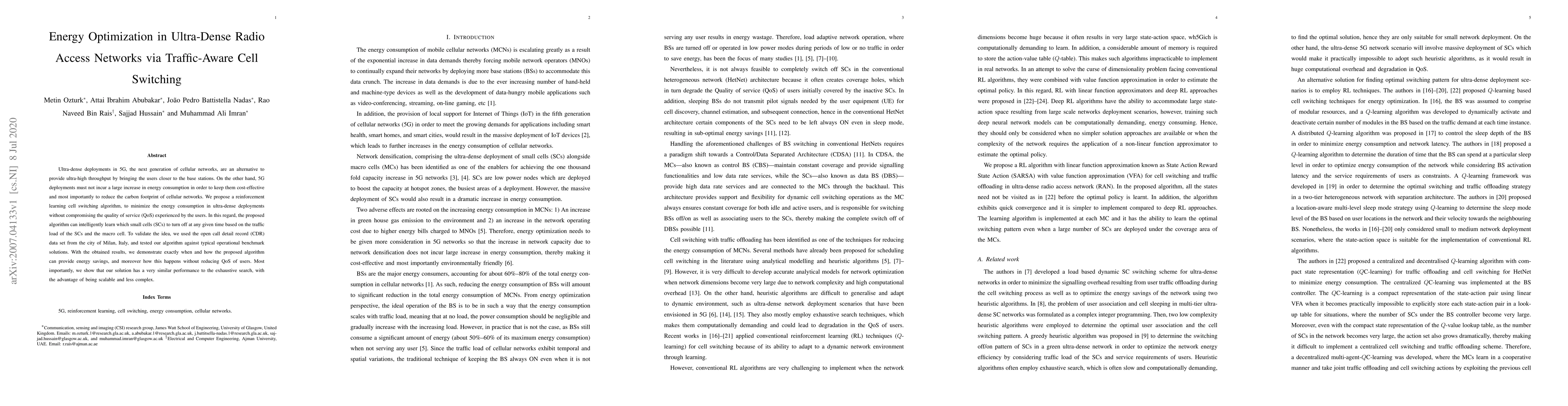 This paper proposes a reinforcement learning algorithm for traffic-aware cell switching in ultra-dense 5G networks to optimize energy consumption without compromising user QoS. The algorithm intelligently turns off small cells based on traffic load, validated using Milan's CDR data, showing significant energy savings with comparable performance to exhaustive search.