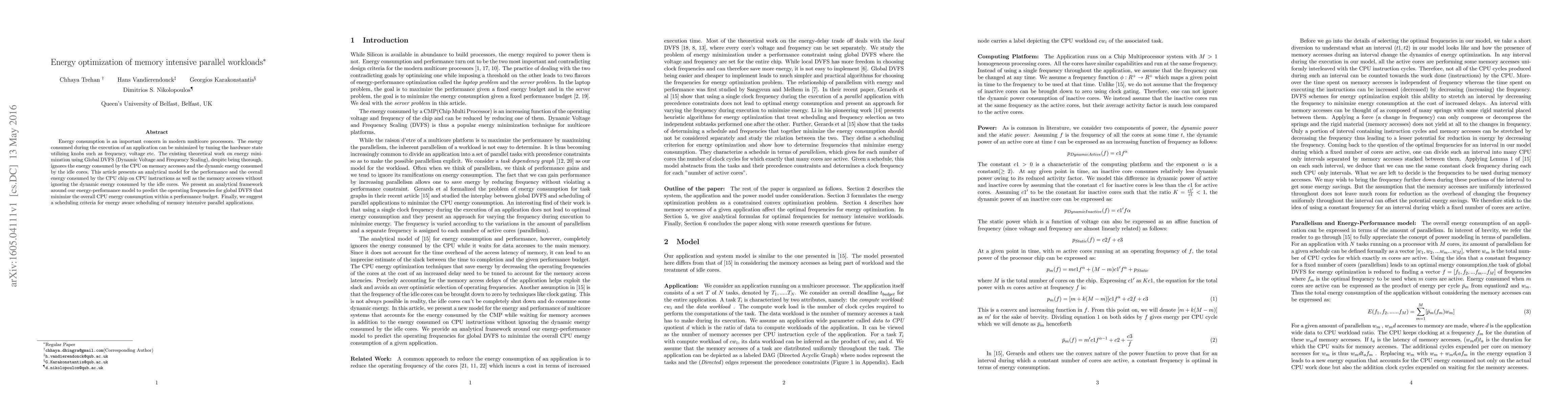This paper presents an analytical model for optimizing energy consumption in multicore processors, focusing on memory accesses and idle cores. It proposes a framework to predict optimal frequencies for global DVFS to minimize CPU energy within a performance budget and suggests scheduling criteria for energy-efficient parallel workloads.