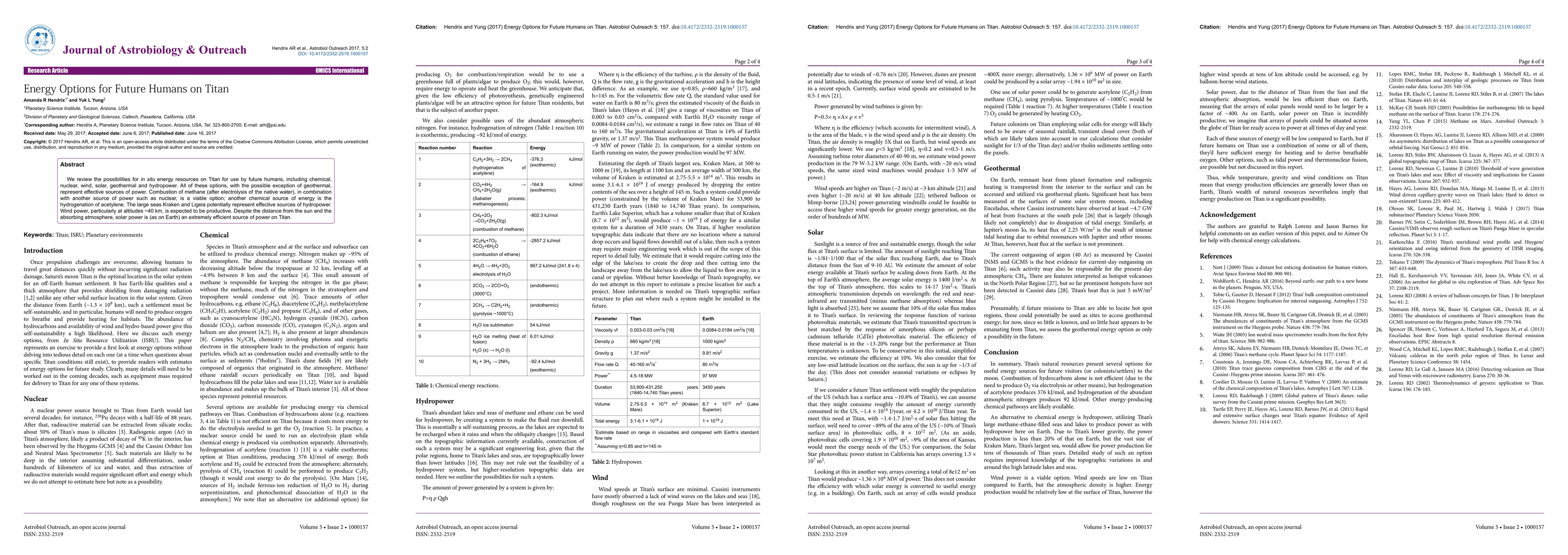We review the possibilities for in situ energy resources on Titan for use by future humans, including chemical, nuclear, wind, solar, geothermal and hydropower. All of these options, with the possible exception of geothermal, represent effective sources of power. Combustion of methane (after electrolysis of the native water), in combination with another source of power such as nuclear, is a viable option; another chemical source of energy is the hydrogenation of acetylene. The large seas Kraken and Ligeia potentially represent effective sources of hydropower. Wind power, particularly at altitudes ~40 km, is expected to be productive. Despite the distance from the sun and the absorbing atmosphere, solar power is (as on Earth) an extremely efficient source of power on Titan.