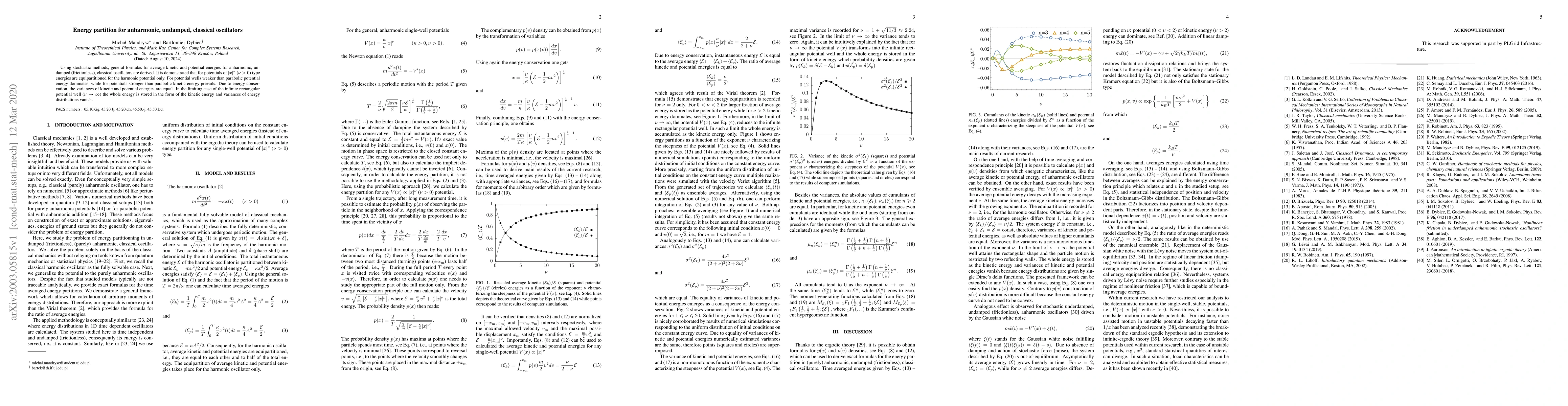 This paper derives general formulas for average kinetic and potential energies of undamped classical oscillators using stochastic methods. It finds that equipartition of energy occurs only for harmonic potentials; for weaker potentials, potential energy dominates, while stronger potentials favor kinetic energy dominance.