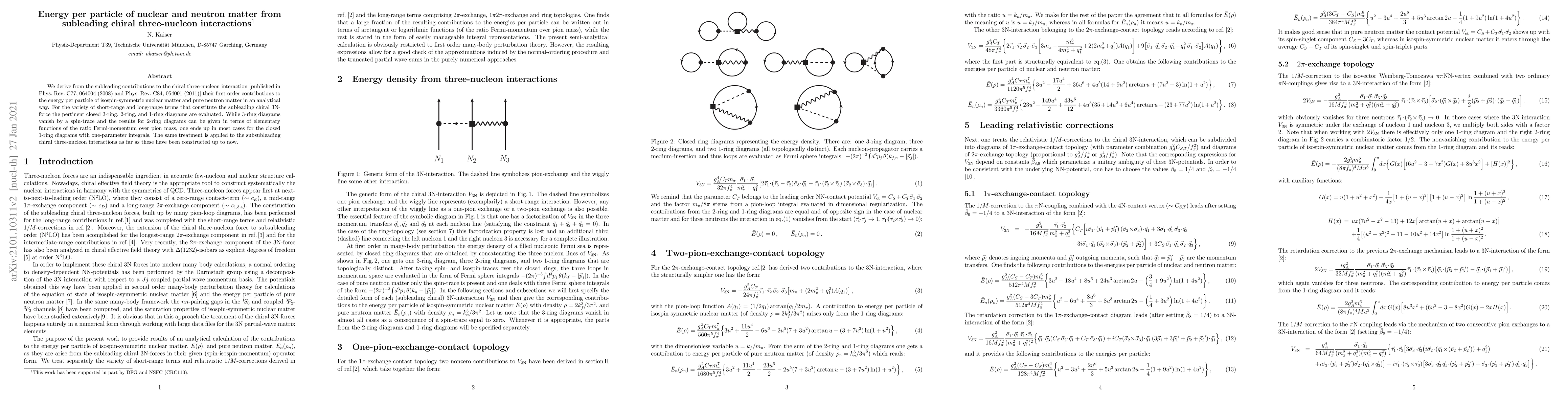 Researchers derived first-order energy per particle contributions for isospin-symmetric nuclear matter and pure neutron matter from subleading chiral three-nucleon interactions using analytical methods.
