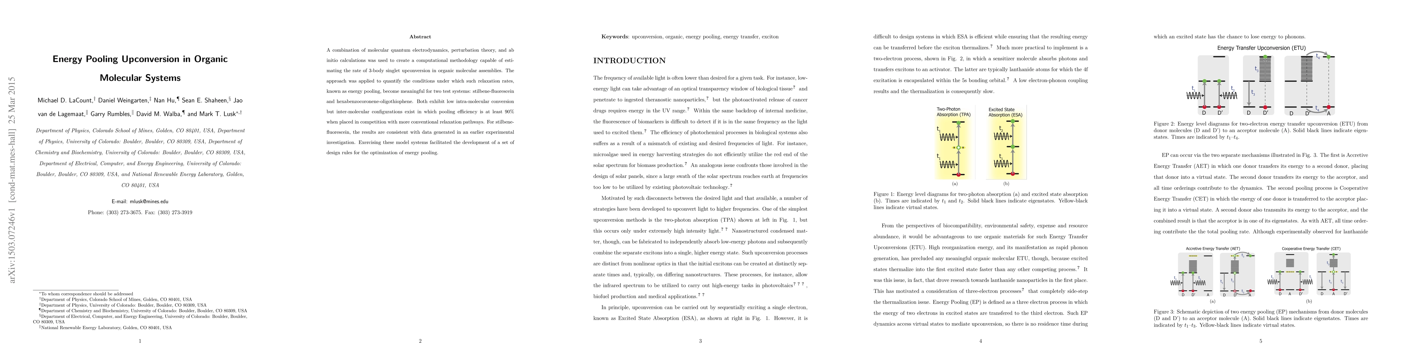 A combination of molecular quantum electrodynamics, perturbation theory, and ab initio calculations was used to create a computational methodology capable of estimating the rate of 3-body singlet upconversion in organic molecular assemblies. The approach was applied to quantify the conditions under which such relaxation rates, known as energy pooling, become meaningful for two test systems: stilbene-fluorescein and hexabenzocoronene-oligothiophene. Both exhibit low intra-molecular conversion but inter-molecular configurations exist in which pooling efficiency is at least 90\% when placed in competition with more conventional relaxation pathways. For stilbene-fluorescein, the results are consistent with data generated in an earlier experimental investigation. Exercising these model systems facilitated the development of a set of design rules for the optimization of energy pooling.