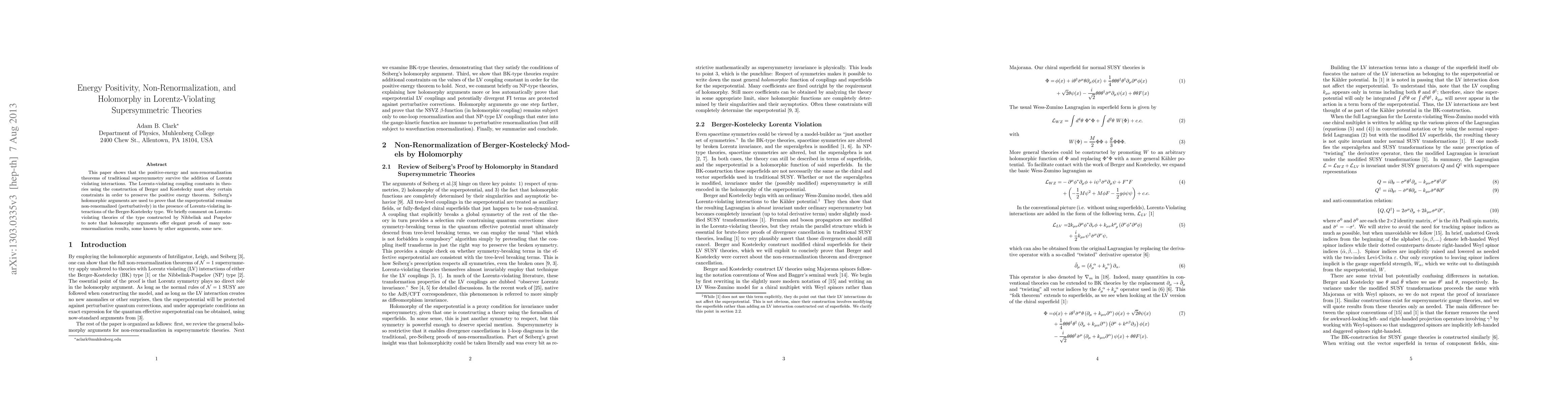 This paper shows that the positive-energy and non-renormalization theorems of traditional supersymmetry survive the addition of Lorentz violating interactions. The Lorentz-violating coupling constants in theories using the construction of Berger and Kostelecky must obey certain constraints in order to preserve the positive energy theorem. Seiberg's holomorphic arguments are used to prove that the superpotential remains non-renormalized (perturbatively) in the presence of Lorentz-violating interactions of the Berger-Kostelecky type. We briefly comment on Lorentz-violating theories of the type constructed by Nibbelink and Pospelov to note that holomorphy arguments offer elegant proofs of many non-renormalization results, some known by other arguments, some new.