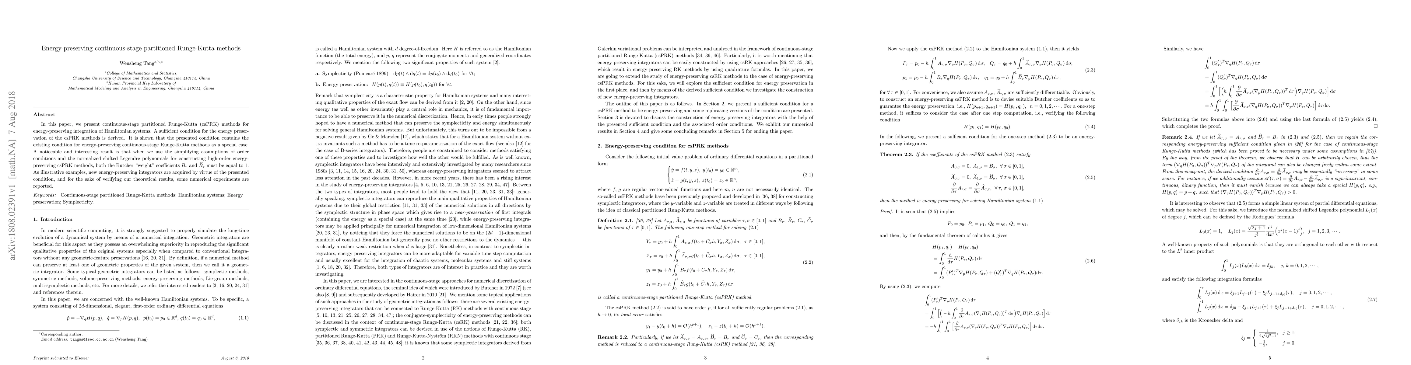 This paper introduces continuous-stage partitioned Runge-Kutta methods (csPRK) for energy-preserving integration of Hamiltonian systems, deriving a sufficient condition for their energy preservation. It demonstrates that this condition generalizes existing methods and reveals that high-order csPRK integrators must have specific coefficient values under simplifying assumptions.