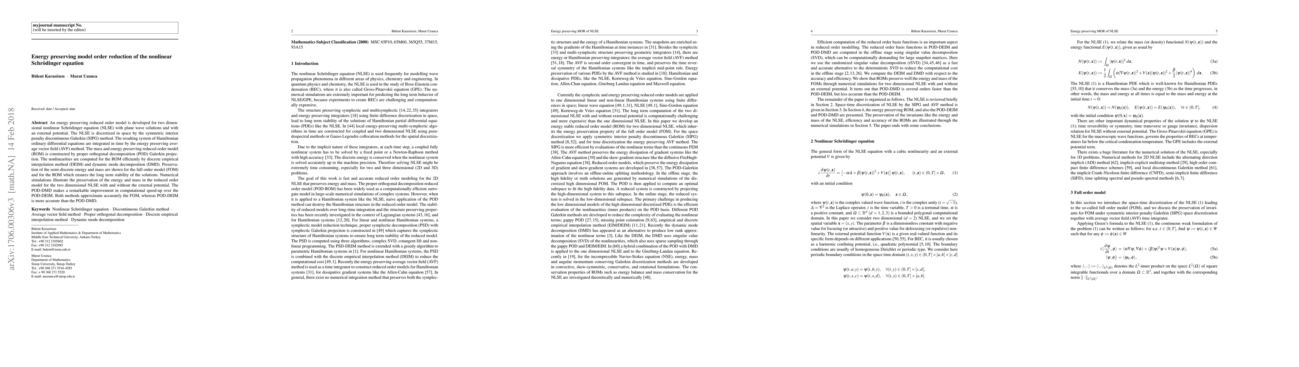 An energy preserving reduced order model is developed for two dimensional nonlinear Schr\"odinger equation (NLSE) with plane wave solutions and with an external potential. The NLSE is discretized in space by the symmetric interior penalty discontinuous Galerkin (SIPG) method. The resulting system of Hamiltonian ordinary differential equations are integrated in time by the energy preserving average vector field (AVF) method. The mass and energy preserving reduced order model (ROM) is constructed by proper orthogonal decomposition (POD) Galerkin projection. The nonlinearities are computed for the ROM efficiently by discrete empirical interpolation method (DEIM) and dynamic mode decomposition (DMD). Preservation of the semi-discrete energy and mass are shown for the full order model (FOM) and for the ROM which ensures the long term stability of the solutions. Numerical simulations illustrate the preservation of the energy and mass in the reduced order model for the two dimensional NLSE with and without the external potential. The POD-DMD makes a remarkable improvement in computational speed-up over the POD-DEIM. Both methods approximate accurately the FOM, whereas POD-DEIM is more accurate than the POD-DMD.