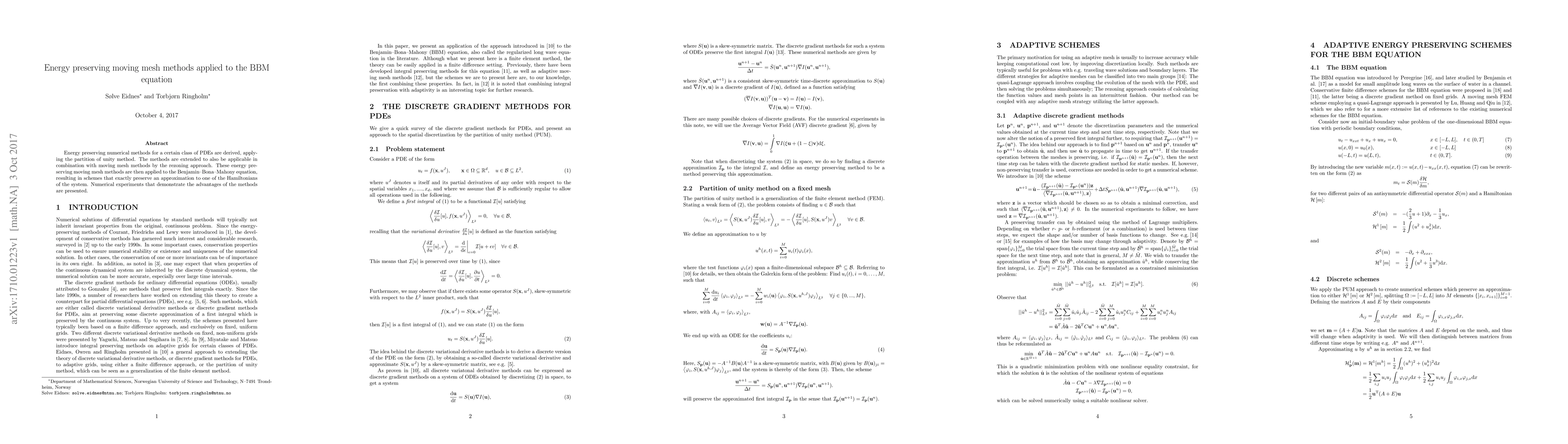 This paper develops energy preserving numerical methods for PDEs using the partition of unity method, extending them to moving mesh techniques via rezoning. The proposed methods are applied to the Benjamin-Bona-Mahony equation, achieving exact Hamiltonian approximation, and numerical experiments highlight their benefits.