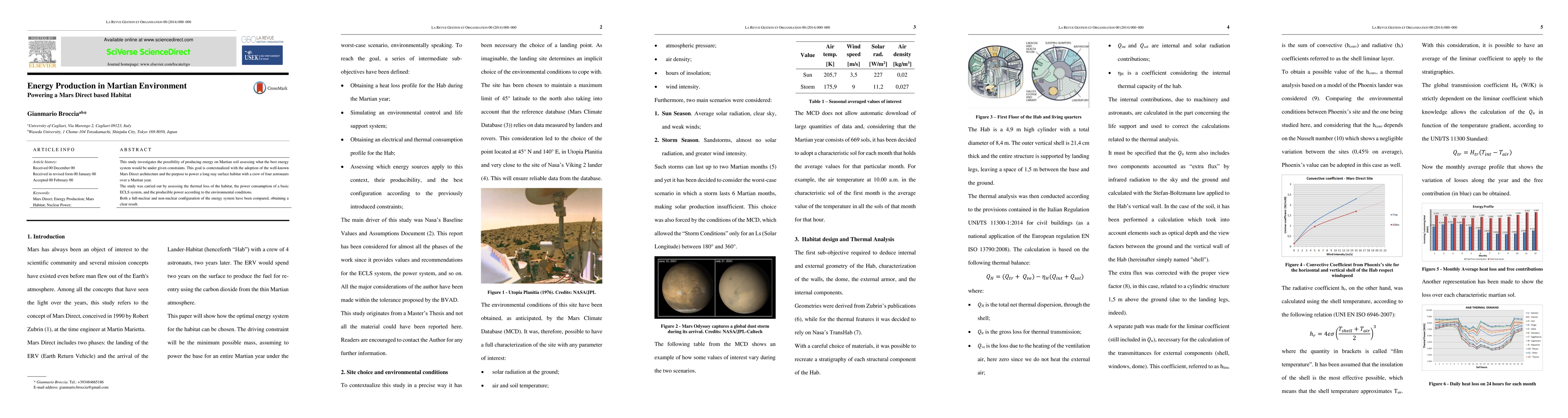 This thesis work aims to study the possibility of energy production on Martian soil and, in particular, to establish what might be an optimal configuration for an energy system. This goal has been contextualized in the will to feed a scientific base, based the concept of "Mars Direct" (Robert Zubrin, 1990). This habitat has been recreated in its thermal features, in order to perform an analysis of the heat loss over a Martian year (1,88 terrestrial years). As part of this analysis, two possible scenarios have been studied: clear sky with medium solar radiation ("sun season") and sand storm season ("storm season"). Subsequently, a basic life support system have been simulated thanks to Aspen PLUS. Using the results of the thermal analysis, it has been possible to obtain a thermal and electrical demand profile for the Hab. After identifying every possible energy source (solar, wind, nuclear, fuel cells, rtg), a calculation on Excel has been set with the purpose of finding one of the configurations with the lowest possible mass and pave the way for a further, more rigorous, optimization. It is indeed clear that shipping 1 kilogram to Mars has a cost of hundreds of thousand of dollars.