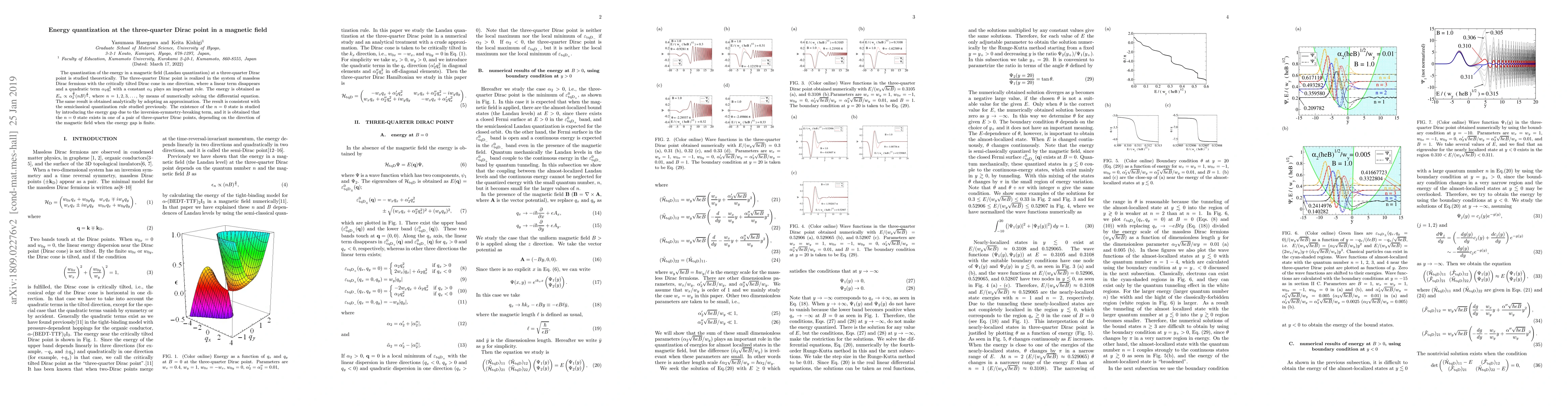 The quantization of the energy in a magnetic field (Landau quantization) at a three-quarter Dirac point is studied theoretically. The three-quarter Dirac point is realized in the system of massless Dirac fermions with the critically tilted Dirac cone in one direction, where a linear term disappears and a quadratic term $\alpha_2 q_x^2$ with aconstant $\alpha_2$ plays an important role. The energy is obtained as $E_n \propto \alpha_2^{\frac{3}{5}} (n B)^{\frac{4}{5}}$, where $n=1, 2, 3, \dots$, by means of numerically and analytically solving the differential equation, as well as by the semiclassical quantization rule. The existence of the $n=0$ state is studied by introducing the energy gap due to the inversion-symmetry-breaking term, and it is obtained that the $n=0$ state exists in one of a pair of three-quarter Dirac points, depending on the direction of the magnetic field when the energy gap is finite.