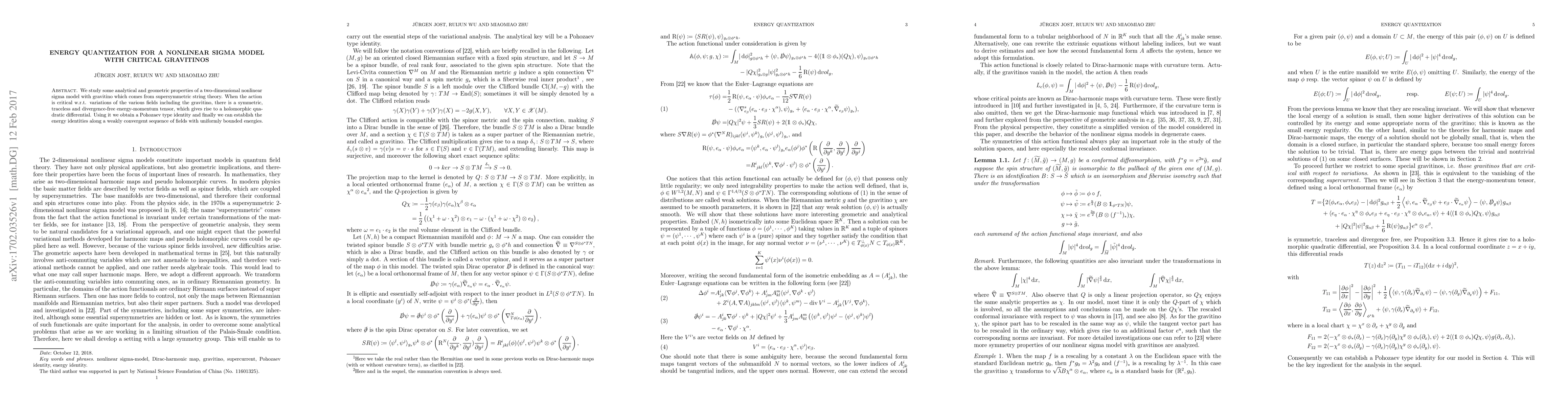 We study some analytical and geometric properties of a two-dimensional nonlinear sigma model with gravitino which comes from supersymmetric string theory. When the action is critical w.r.t. variations of the various fields including the gravitino, there is a symmetric, traceless and divergence-free energy-momentum tensor, which gives rise to a holomorphic quadratic differential. Using it we obtain a Pohozaev type identity and finally we can establish the energy identities along a weakly convergent sequence of fields with uniformly bounded energies.