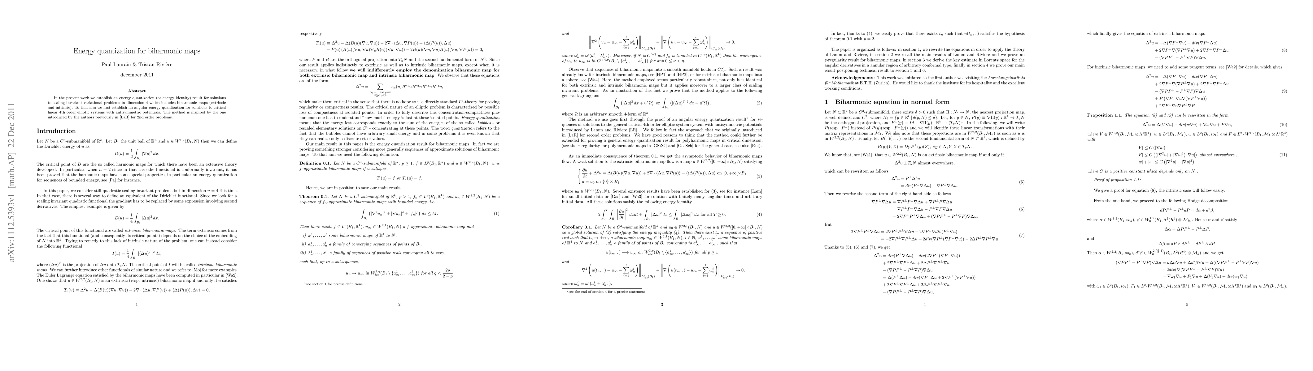 This paper establishes an energy quantization result for biharmonic maps in dimension 4, building on previous methods for 2nd order problems. It first proves an angular energy quantization for critical linear 4th order elliptic systems with antisymmetric potentials.