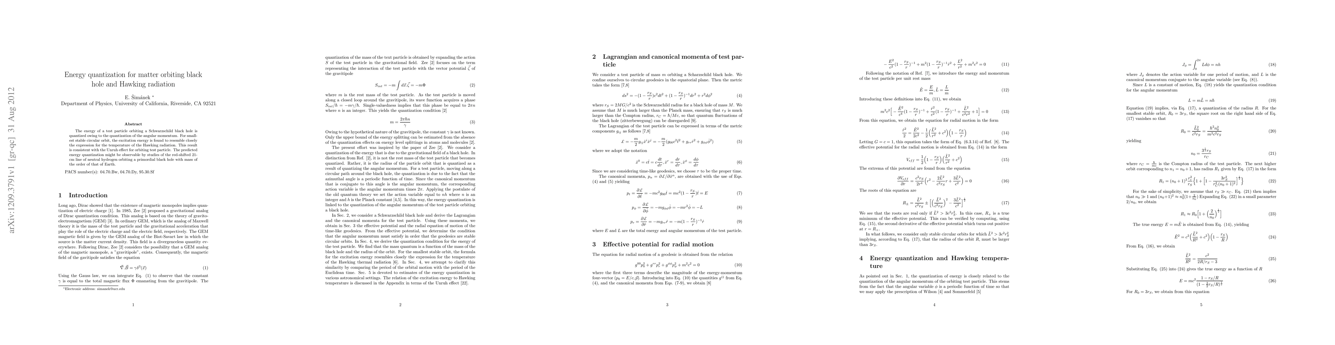 The energy of a test particle orbiting a Schwarzschild black hole is quantized owing to the quantization of the angular momentum. For smallest stable circular orbit, the excitation energy is found to resemble closely the expression for the temperature of the Hawking radiation. This result is consistent with the Unruh effect for orbiting test particle. The predicted energy quantization might be observable by studies of the red-shifted 21-cm line of neutral hydrogen orbiting a primordial black hole with mass of the order of that of Earth.