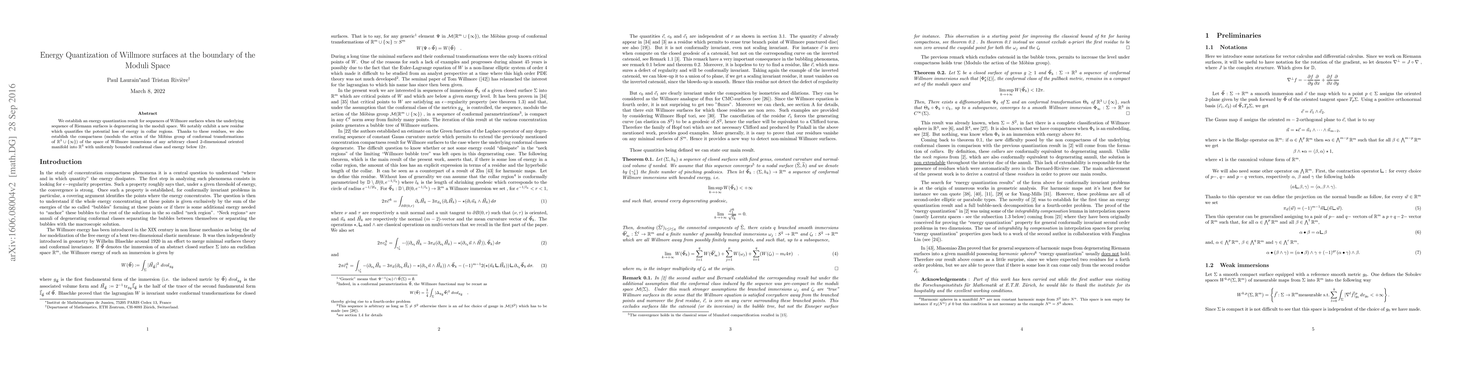 This paper establishes an energy quantization for sequences of Willmore surfaces as they degenerate in moduli space, introducing a new residue to quantify energy loss in collar regions. It also proves compactness for Willmore immersions with a bounded conformal class and energy below $12\pi$.