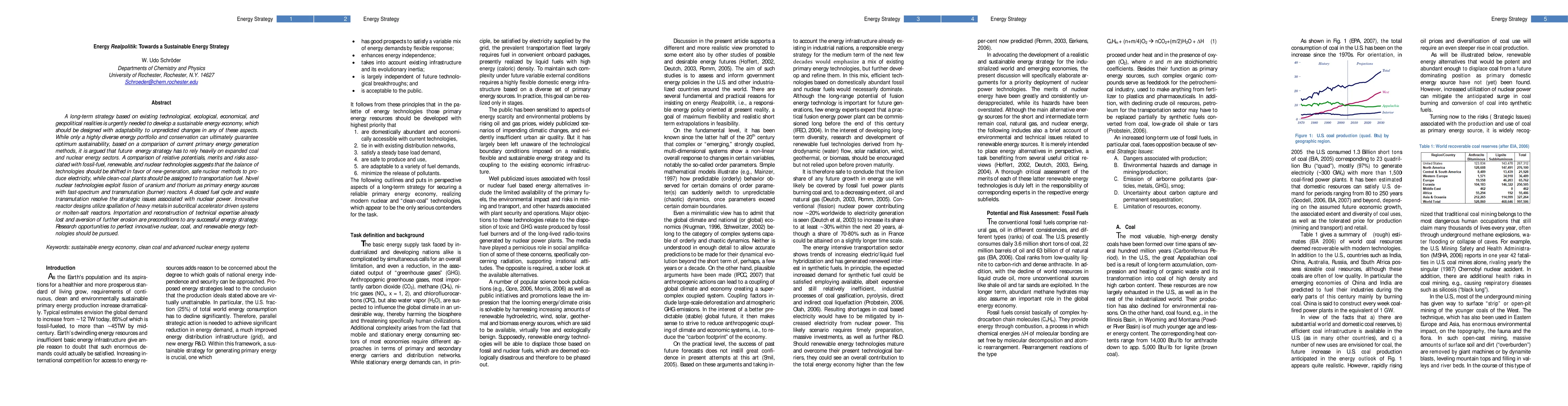 A long-term strategy based on existing technological, ecological, economical, and geopolitical realities is urgently needed to develop a sustainable energy economy, which should be designed with adaptability to unpredicted changes in any of these aspects. While only a highly diverse energy portfolio and conservation can ultimately guarantee optimum sustainability, based on a comparison of current primary energy generation methods, it is argued that future energy strategy has to rely heavily on expanded coal and nuclear energy sectors. A comparison of relative potentials, merits and risks associated with fossil-fuel, renewable, and nuclear technologies suggests that the balance of technologies should be shifted in favor of new-generation, safe nuclear methods to produce electricity, while clean-coal plants should be assigned to transportation fuel. Novel nuclear technologies exploit fission of uranium and thorium as primary energy sources with fast-spectrum and transmutation (burner) reactors. A closed fuel cycle and waste transmutation resolve the strategic issues associated with nuclear power. Innovative reactor designs utilize spallation of heavy metals in subcritical accelerator driven systems or molten-salt reactors. Importation and reconstruction of technical expertise already lost and aversion of further erosion are preconditions to any successful energy strategy. Research opportunities to perfect innovative nuclear, coal, and renewable energy technologies should be pursued.
