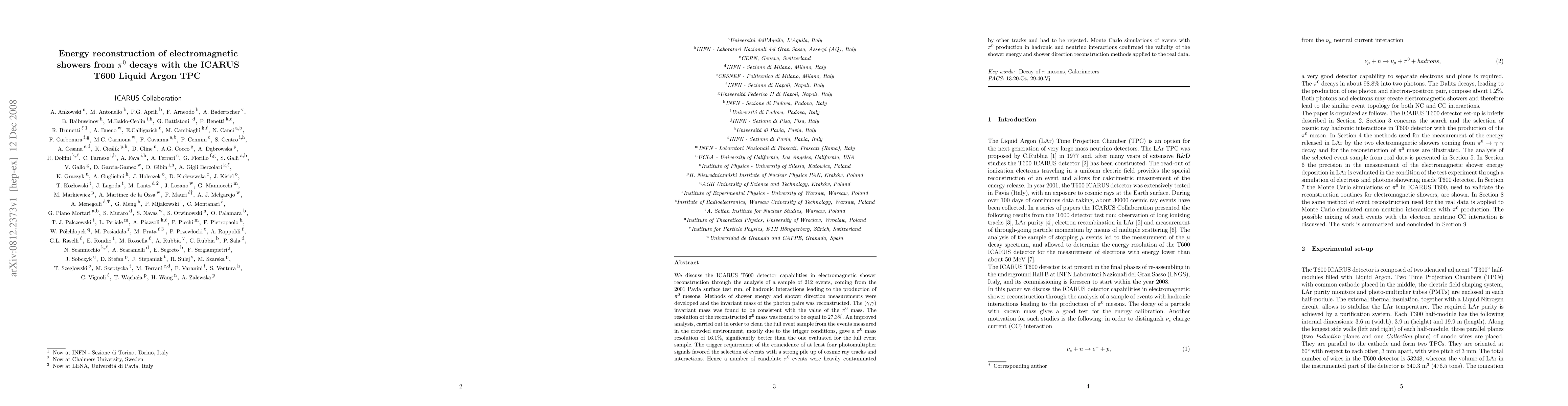 We discuss the ICARUS T600 detector capabilities in electromagnetic shower reconstruction through the analysis of a sample of 212 events, coming from the 2001 Pavia surface test run, of hadronic interactions leading to the production of $\pi^{0}$ mesons. Methods of shower energy and shower direction measurements were developed and the invariant mass of the photon pairs was reconstructed. The ($\gamma$,$\gamma$) invariant mass was found to be consistent with the value of the $\pi^0$ mass. The resolution of the reconstructed $\pi^0$ mass was found to be equal to 27.3%. An improved analysis, carried out in order to clean the full event sample from the events measured in the crowded environment, mostly due to the trigger conditions, gave a $\pi^0$ mass resolution of 16.1%, significantly better than the one evaluated for the full event sample. The trigger requirement of the coincidence of at least four photomultiplier signals favored the selection of events with a strong pile up of cosmic ray tracks and interactions. Hence a number of candidate $\pi^0$ events were heavily contaminated by other tracks and had to be rejected. Monte Carlo simulations of events with $\pi^0$ production in hadronic and neutrino interactions confirmed the validity of the shower energy and shower direction reconstruction methods applied to the real data.