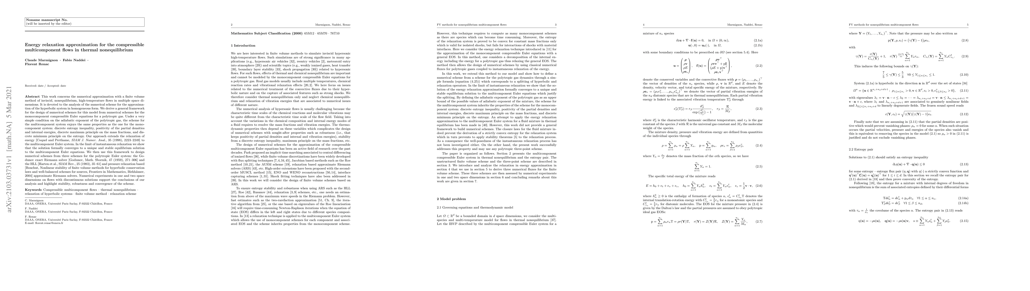 This work concerns the numerical approximation with a finite volume method of inviscid, nonequilibrium, high-temperature flows in multiple space dimensions. It is devoted to the analysis of the numerical scheme for the approximation of the hyperbolic system in homogeneous form. We derive a general framework for the design of numerical schemes for this model from numerical schemes for the monocomponent compressible Euler equations for a polytropic gas. Under a very simple condition on the adiabatic exponent of the polytropic gas, the scheme for the multicomponent system enjoys the same properties as the one for the monocomponent system: discrete entropy inequality, positivity of the partial densities and internal energies, discrete maximum principle on the mass fractions, and discrete minimum principle on the entropy. Our approach extends the relaxation of energy [Coquel and Perthame, \textit{SIAM J. Numer. Anal.}, 35 (1998), 2223--2249] to the multicomponent Euler system. In the limit of instantaneous relaxation we show that the solution formally converges to a unique and stable equilibrium solution to the multicomponent Euler equations. We then use this framework to design numerical schemes from three schemes for the polytropic Euler system: the Godunov exact Riemann solver [Godunov, Math. Sbornik, 47 (1959), 271--306] and the HLL [Harten et al., SIAM Rev., 25 (1983), 35--61] and pressure relaxation based [Bouchut, Nonlinear stability of finite volume methods for hyperbolic conservation laws and well-balanced schemes for sources, Frontiers in Mathematics, Birkh\"auser, 2004] approximate Riemann solvers. Numerical experiments in one and two space dimensions on flows with discontinuous solutions support the conclusions of our analysis and highlight stability, robustness and convergence of the scheme.