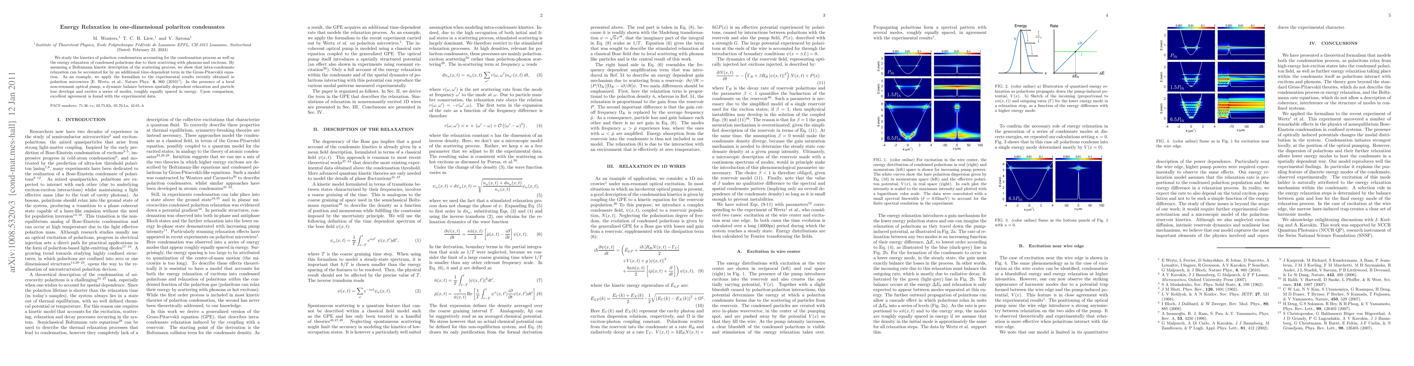 We study the kinetics of polariton condensation accounting for the condensation process as well as the energy relaxation of condensed polaritons due to their scattering with phonons and excitons. By assuming a Boltzmann kinetic description of the scattering process, we show that intra-condensate relaxation can be accounted for by an additional time-dependent term in the Gross-Pitaevskii equation. As an example, we apply the formalism to the experimental results recently obtained in polariton microwires [E. Wertz, et al., Nature Phys. 6, 860 (2010)]. In the presence of a local non-resonant optical pump, a dynamic balance between spatially dependent relaxation and particle loss develops and excites a series of modes, roughly equally spaced in energy. Upon comparison, excellent agreement is found with the experimental data.