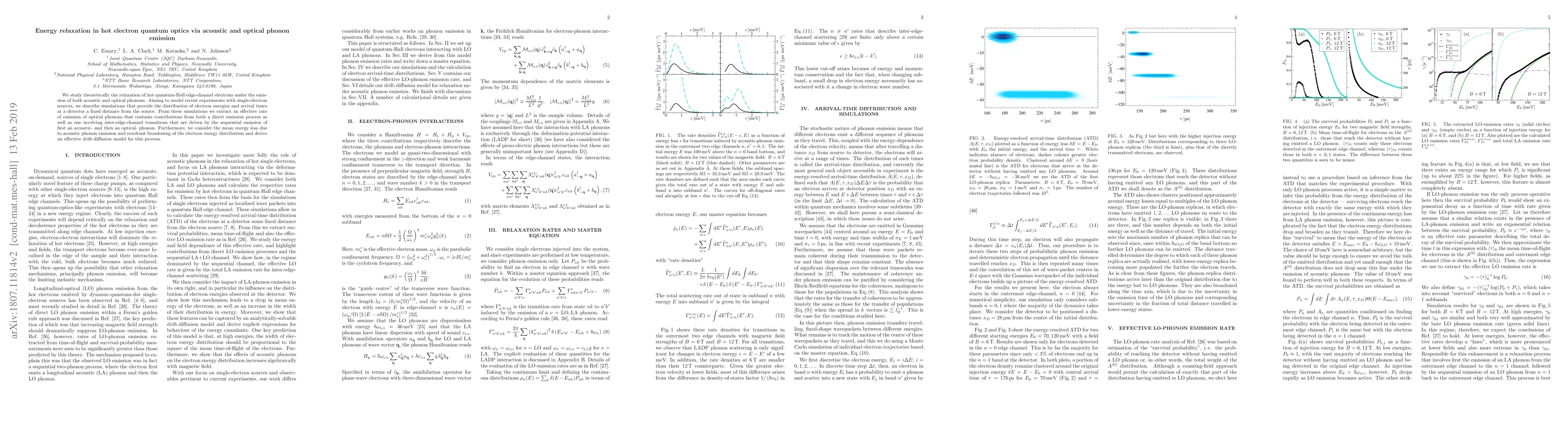This paper theoretically investigates the relaxation mechanisms of hot quantum-Hall electrons via acoustic and optical phonon emissions, modeling their energy distribution and arrival times at a detector. It extracts an effective optical phonon emission rate and develops a drift-diffusion model for mean energy loss due to acoustic phonon emission.