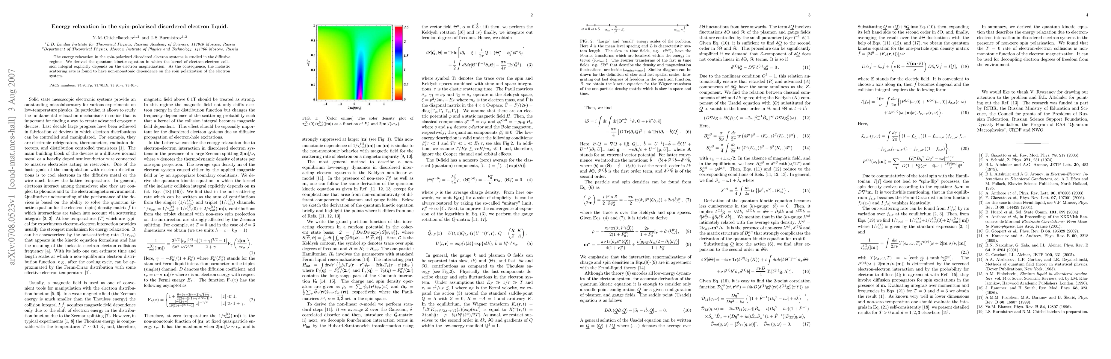 This paper investigates energy relaxation in spin-polarized disordered electron liquids, deriving a quantum kinetic equation where the electron-electron collision kernel depends on magnetization. It finds that the inelastic scattering rate exhibits a non-monotonic relationship with spin polarization.