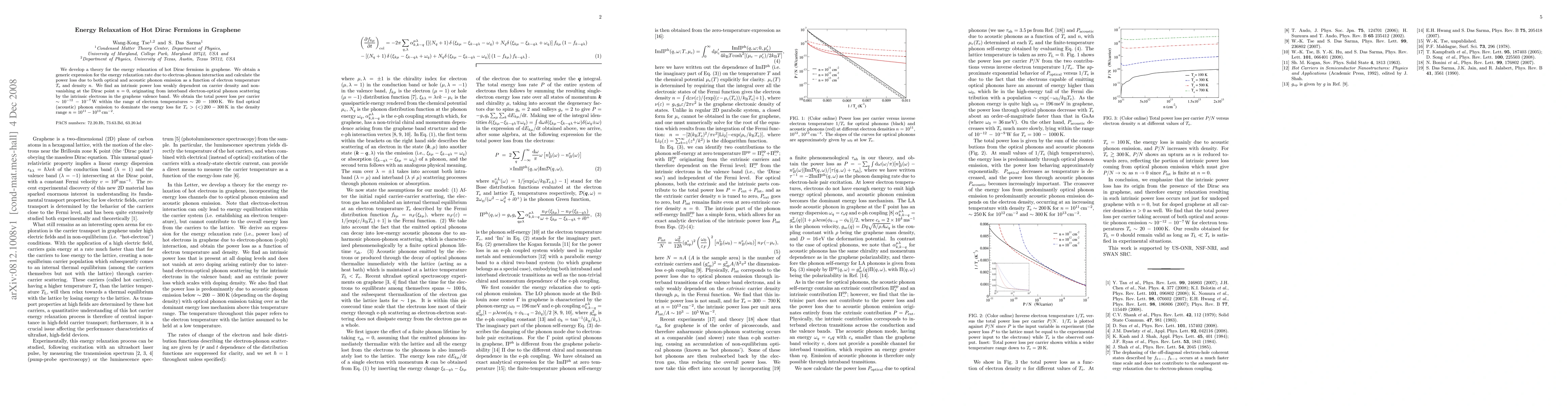 This research develops a theory for the energy relaxation of hot Dirac fermions in graphene, revealing intrinsic power loss from electron-phonon interactions that varies weakly with carrier density and is non-zero at the Dirac point, with total power loss between $10^{-12} - 10^{-7}$ W for electron temperatures from 20 to 1000 K. Optical phonon emission dominates energy loss above 200-300 K.