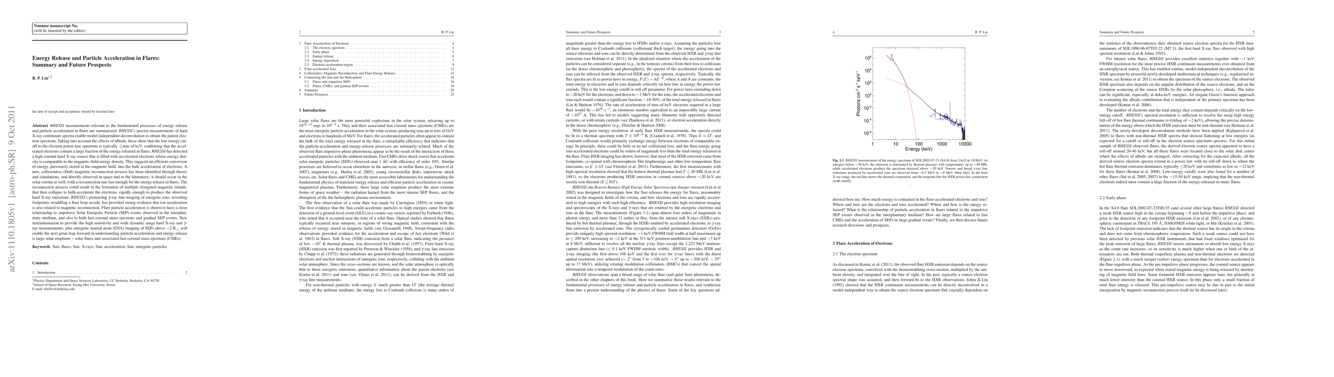 RHESSI measurements relevant to the fundamental processes of energy release and particle acceleration in flares are summarized. RHESSI's precise measurements of hard X-ray continuum spectra enable model-independent deconvolution to obtain the parent electron spectrum. Taking into account the effects of albedo, these show that the low energy cut-off to the electron power-law spectrum is typically below tens of keV, confirming that the accelerated electrons contain a large fraction of the energy released in flares. RHESSI has detected a high coronal hard X-ray source that is filled with accelerated electrons whose energy density is comparable to the magnetic-field energy density. This suggests an efficient conversion of energy, previously stored in the magnetic field, into the bulk acceleration of electrons. A new, collisionless (Hall) magnetic reconnection process has been identified through theory and simulations, and directly observed in space and in the laboratory; it should occur in the solar corona as well, with a reconnection rate fast enough for the energy release in flares. The reconnection process could result in the formation of multiple elongated magnetic islands, that then collapse to bulk-accelerate the electrons, rapidly enough to produce the observed hard X-ray emissions. RHESSI's pioneering {\gamma}-ray line imaging of energetic ions, revealing footpoints straddling a flare loop arcade, has provided strong evidence that ion acceleration is also related to magnetic reconnection. Flare particle acceleration is shown to have a close relationship to impulsive Solar Energetic Particle (SEP) events observed in the interplanetary medium, and also to both fast coronal mass ejections and gradual SEP events.