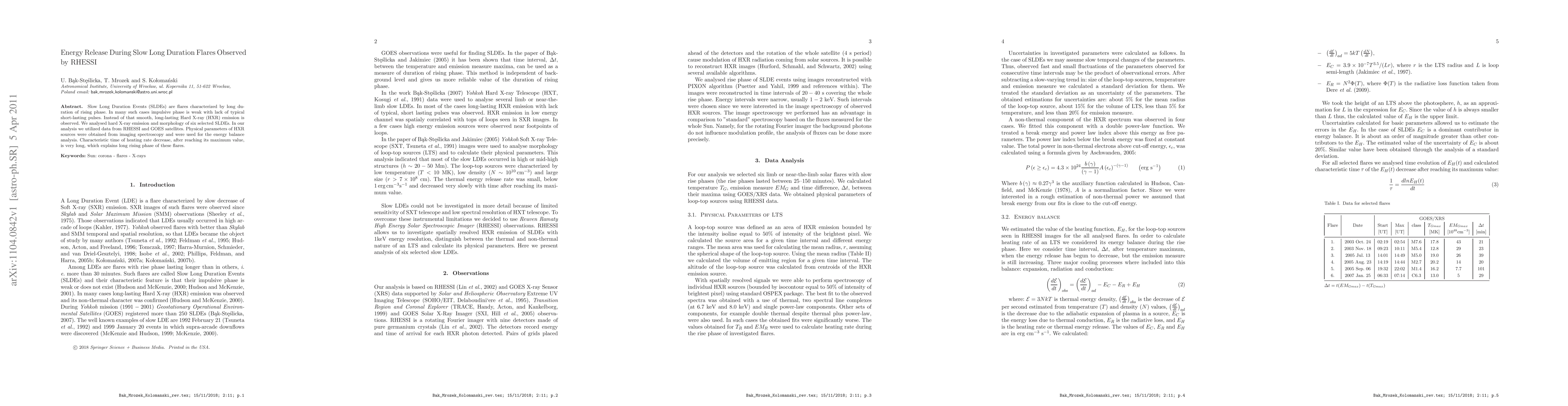 Slow Long Duration Events (SLDEs) are flares characterized by long duration of rising phase. In many such cases impulsive phase is weak with lack of typical short-lasting pulses. Instead of that smooth, long-lasting Hard X-ray (HXR) emission is observed. We analysed hard X-ray emission and morphology of six selected SLDEs. In our analysis we utilized data from RHESSI and GOES satellites. Physical parameters of HXR sources were obtained from imaging spectroscopy and were used for the energy balance analysis. Characteristic time of heating rate decrease, after reaching its maximum value, is very long, which explains long rising phase of these flares.