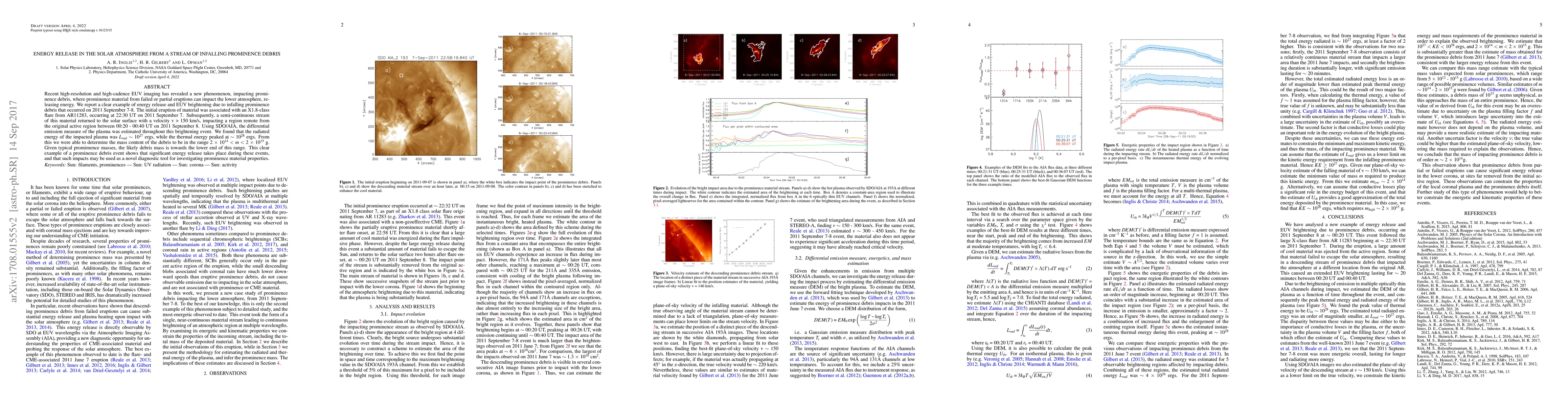 Researchers found significant energy release from infalling prominence debris, releasing 10^27-10^28 ergs of radiation, with a likely debris mass of 2x10^14-2x10^15 g.