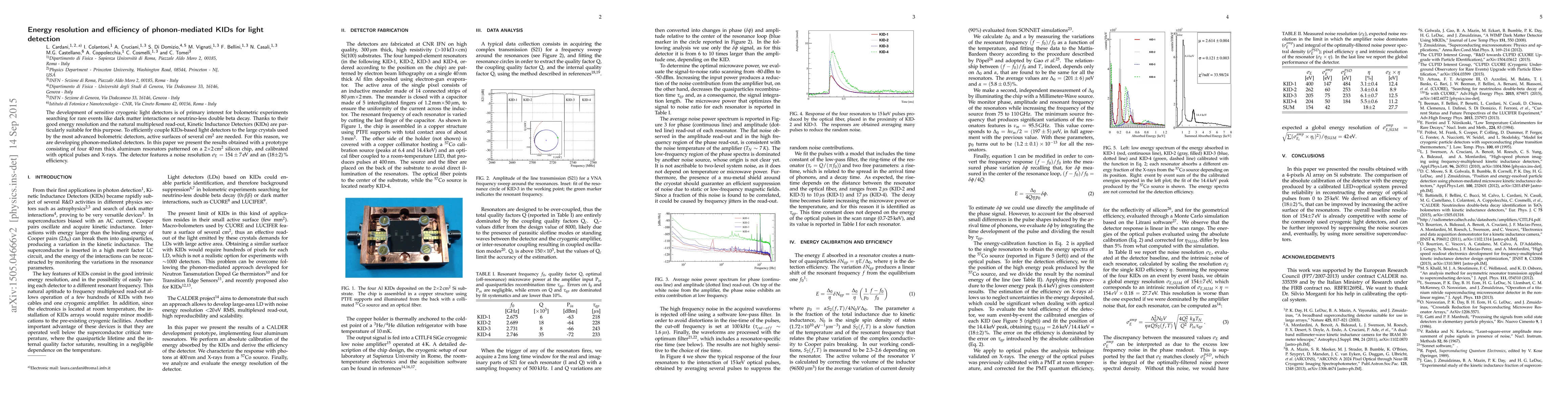 This paper investigates phonon-mediated Kinetic Inductance Detectors (KIDs) for cryogenic light detection, achieving a noise resolution of $\sigma_E=154\pm7$ eV and an efficiency of (18$\pm$2)$\%$. The study highlights KIDs' suitability for rare event searches due to their good energy resolution and multiplexed read-out.