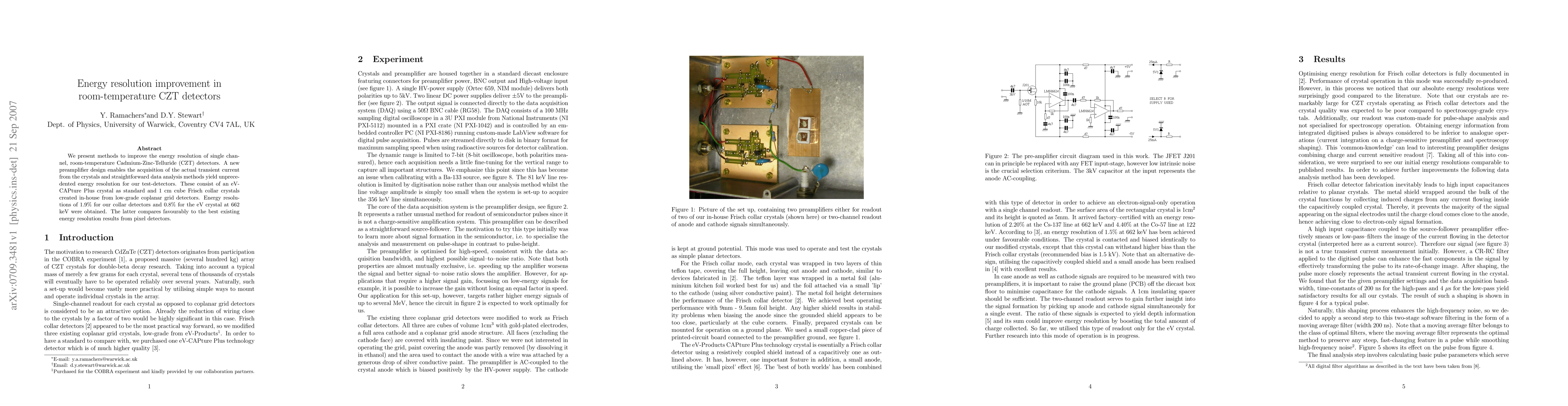 This paper details a new preamplifier design that enhances the energy resolution of room-temperature CZT detectors, achieving unprecedented results with 1.9% resolution for in-house collar detectors and 0.8% for standard eV-CAPture Plus crystals at 662 keV, rivaling the best pixel detectors.