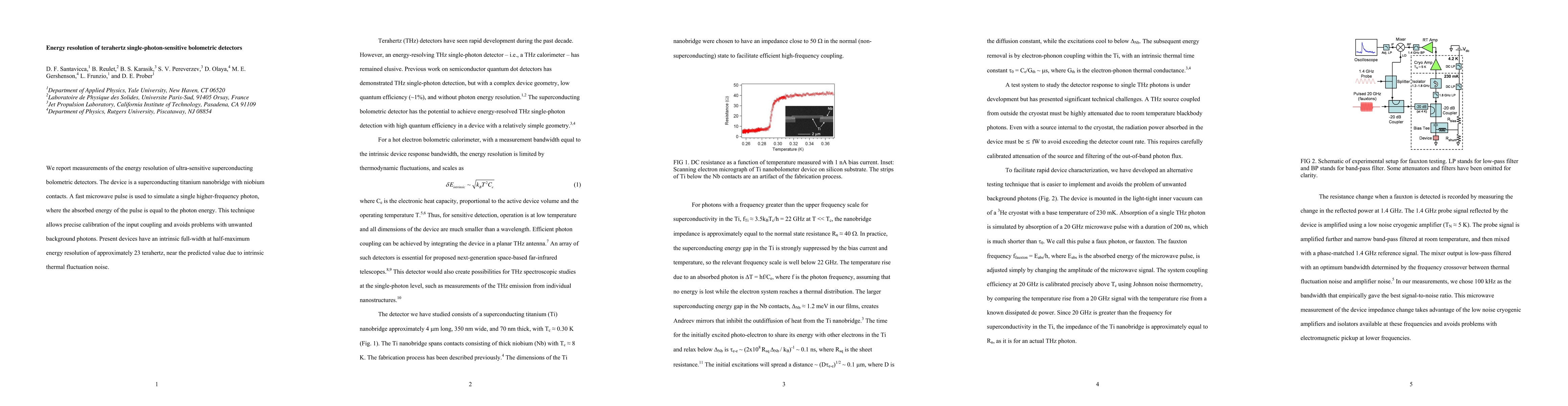 We report measurements of the energy resolution of ultra-sensitive superconducting bolometric detectors. The device is a superconducting titanium nanobridge with niobium contacts. A fast microwave pulse is used to simulate a single higher-frequency photon, where the absorbed energy of the pulse is equal to the photon energy. This technique allows precise calibration of the input coupling and avoids problems with unwanted background photons. Present devices have an intrinsic full-width at half-maximum energy resolution of approximately 23 terahertz, near the predicted value due to intrinsic thermal fluctuation noise.