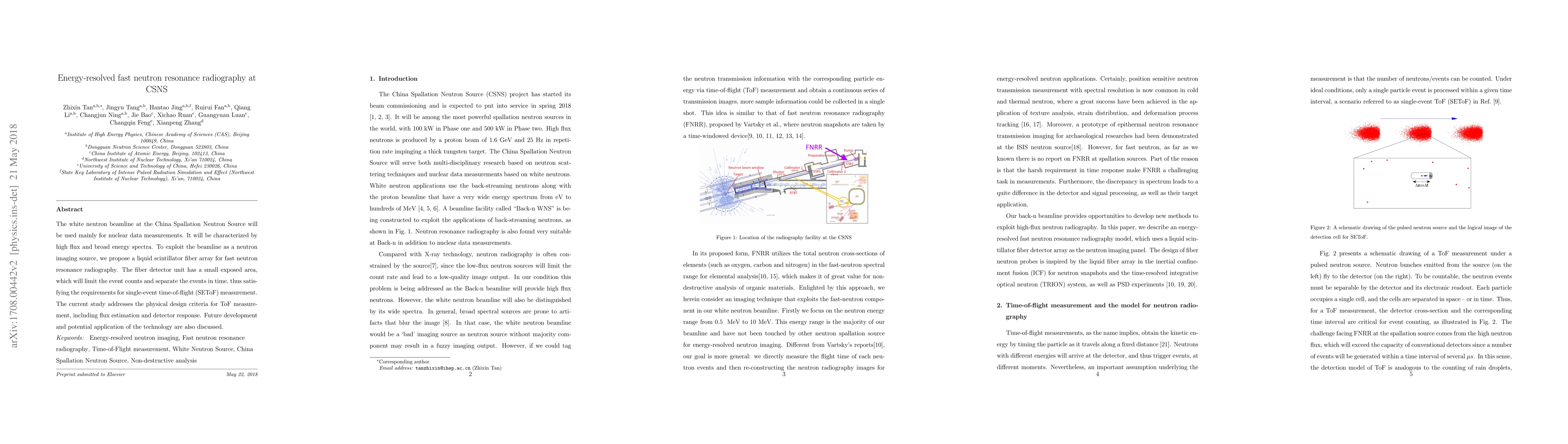 The white neutron beamline at the China Spallation Neutron Source will be used mainly for nuclear data measurements. It will be characterized by high flux and broad energy spectra. To exploit the beamline as a neutron imaging source, we propose a liquid scintillator fiber array for fast neutron resonance radiography. The fiber detector unit has a small exposed area, which will limit the event counts and separate the events in time, thus satisfying the requirements for single-event time-of-flight (SEToF) measurement. The current study addresses the physical design criteria for ToF measurement, including flux estimation and detector response. Future development and potential application of the technology are also discussed.
