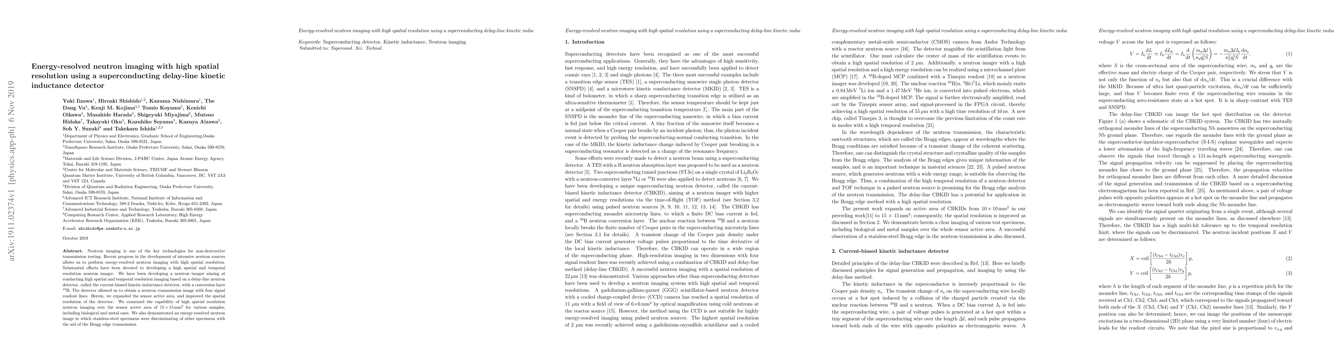 Neutron imaging is one of the key technologies for non-destructive transmission testing. Recent progress in the development of intensive neutron sources allows us to perform energy-resolved neutron imaging with high spatial resolution. Substantial efforts have been devoted to developing a high spatial and temporal resolution neutron imager. We have been developing a neutron imager aiming at conducting high spatial and temporal resolution imaging based on a delay-line neutron detector, called the current-biased kinetic-inductance detector, with a conversion layer $^{10}$B. The detector allowed us to obtain a neutron transmission image with four signal readout lines. Herein, we expanded the sensor active area, and improved the spatial resolution of the detector. We examined the capability of high spatial resolution neutron imaging over the sensor active area of 15 $\times$ 15 mm$^2$ for various samples, including biological and metal ones. We also demonstrated an energy-resolved neutron image in which stainless-steel specimens were discriminating of other specimens with the aid of the Bragg edge transmission.