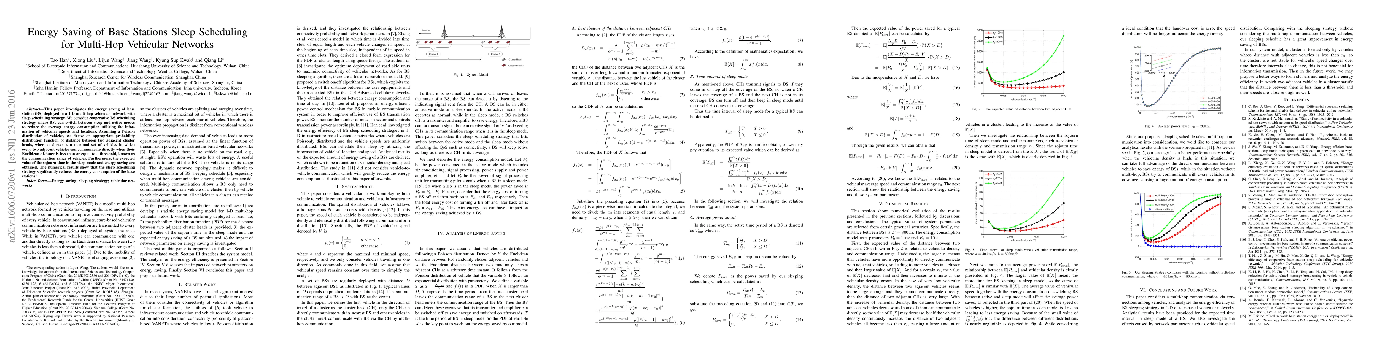 This paper investigates the energy saving of base station (BS) deployed in a 1-D multi-hop vehicular network with sleep scheduling strategy. We consider cooperative BS scheduling strategy where BSs can switch between sleep and active modes to reduce the average energy consumption utilizing the information of vehicular speeds and locations. Assuming a Poisson distribution of vehicles, we derive an appropriate probability distribution function of distance between two adjacent cluster heads, where a cluster is a maximal set of vehicles in which every two adjacent vehicles can communicate directly when their Euclidean distance is less than or equal to a threshold, known as the communication range of vehicles. Furthermore, the expected value of the sojourn time in the sleep mode and energy saving are obtained. The numerical results show that the sleep scheduling strategy significantly reduces the energy consumption of the base stations.