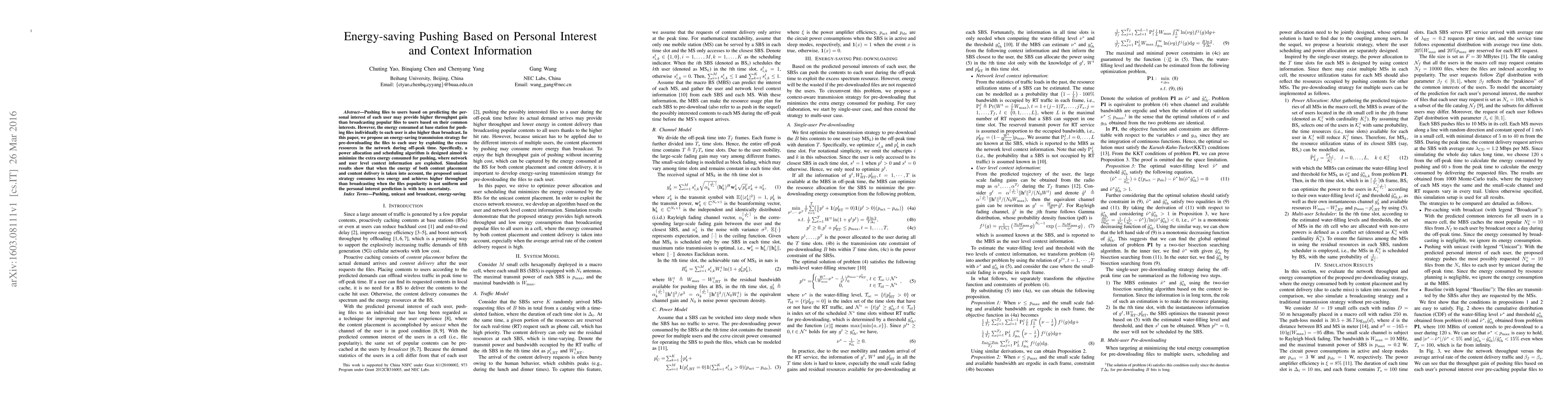 This paper proposes an energy-saving transmission strategy for pre-downloading files to users using excess network resources during off-peak times. A power allocation and scheduling algorithm is designed, utilizing context information to minimize extra energy consumption for personalized pushing, which results in lower energy use and higher throughput compared to broadcasting, especially when file popularity varies and personal interest predictions are accurate.