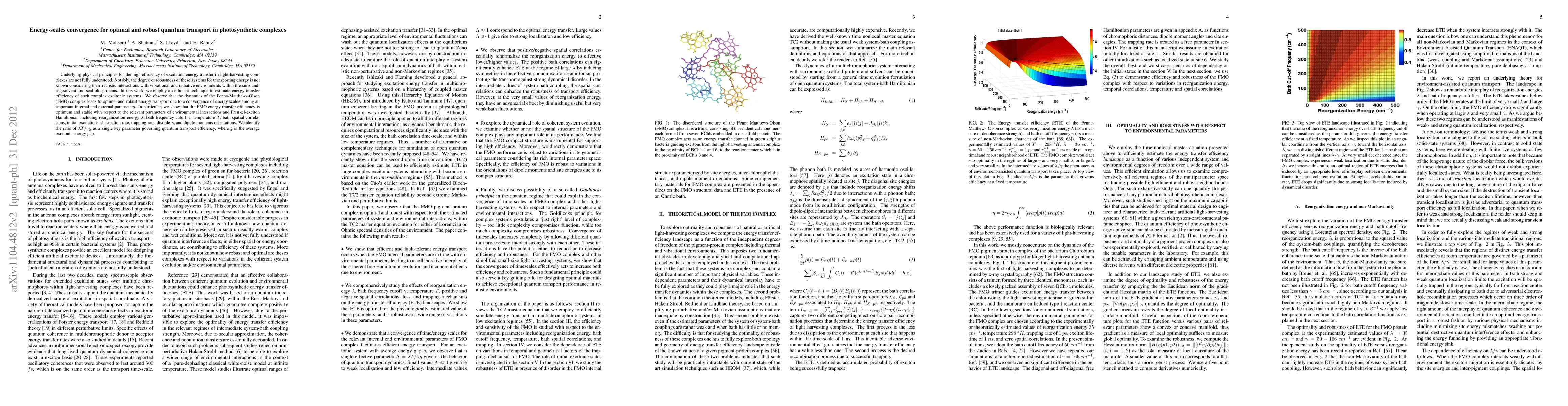 This research paper reveals that energy transfer efficiency in photosynthetic complexes is optimal when internal and external parameters converge, with a key parameter governing quantum transport efficiency being the ratio of reorganization energy to temperature and frequency.