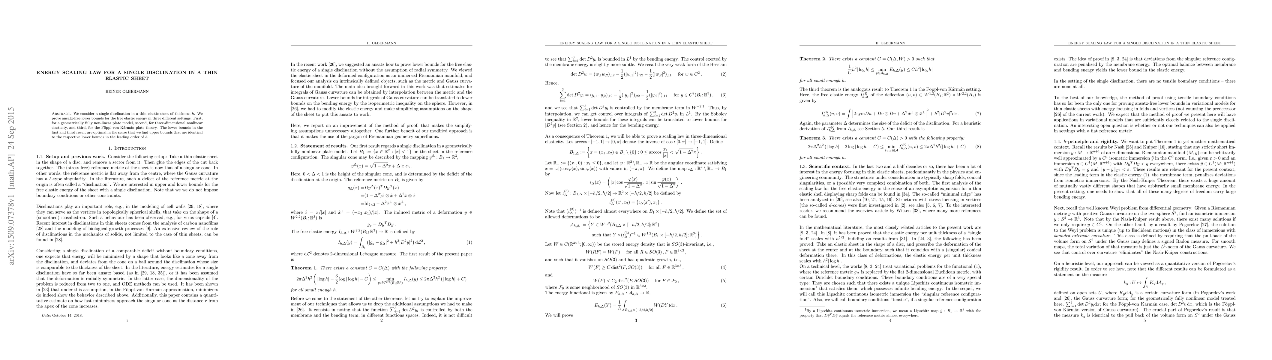 This paper proves ansatz-free lower bounds for the elastic energy of a single disclination in thin elastic sheets across various models, demonstrating optimality in fully non-linear plate and Föppl-von Kármán theories. The results show identical upper and lower bounds in the leading order of the sheet thickness.