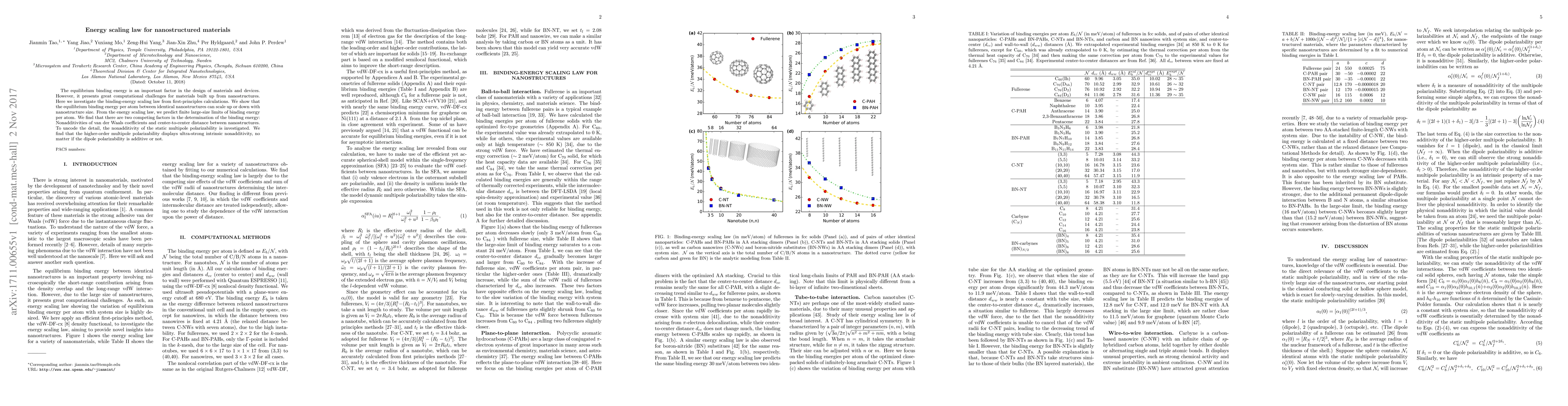 The equilibrium binding energy is an important factor in the design of materials and devices. However, it presents great computational challenges for materials built up from nanostructures. Here we investigate the binding-energy scaling law from first-principles calculations. We show that the equilibrium binding energy per atom between identical nanostructures can scale up or down with nanostructure size. From the energy scaling law, we predict finite large-size limits of binding energy per atom. We find that there are two competing factors in the determination of the binding energy: Nonadditivities of van der Waals coefficients and center-to-center distance between nanostructures. To uncode the detail, the nonadditivity of the static multipole polarizability is investigated. We find that the higher-order multipole polarizability displays ultra-strong intrinsic nonadditivity, no matter if the dipole polarizability is additive or not.