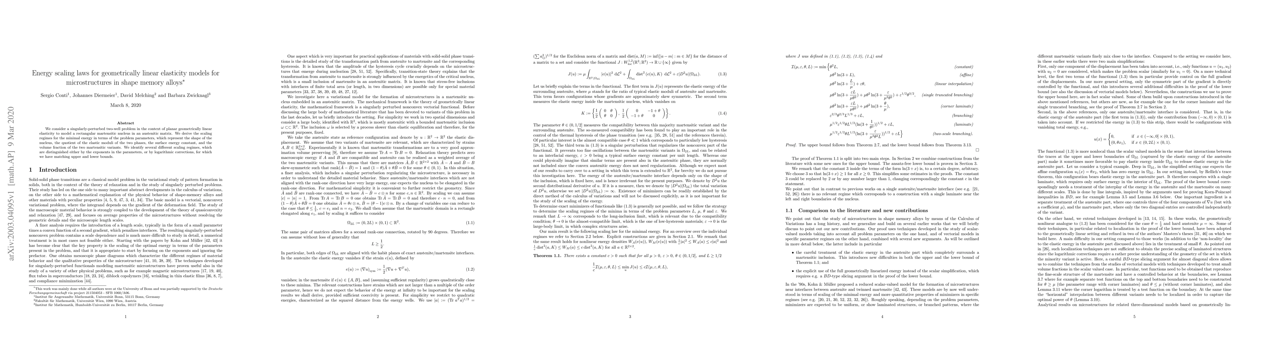 Researchers studied how energy scales in shape memory alloys with different microstructures, finding multiple scaling regimes that depend on key parameters such as material properties and phase volumes.