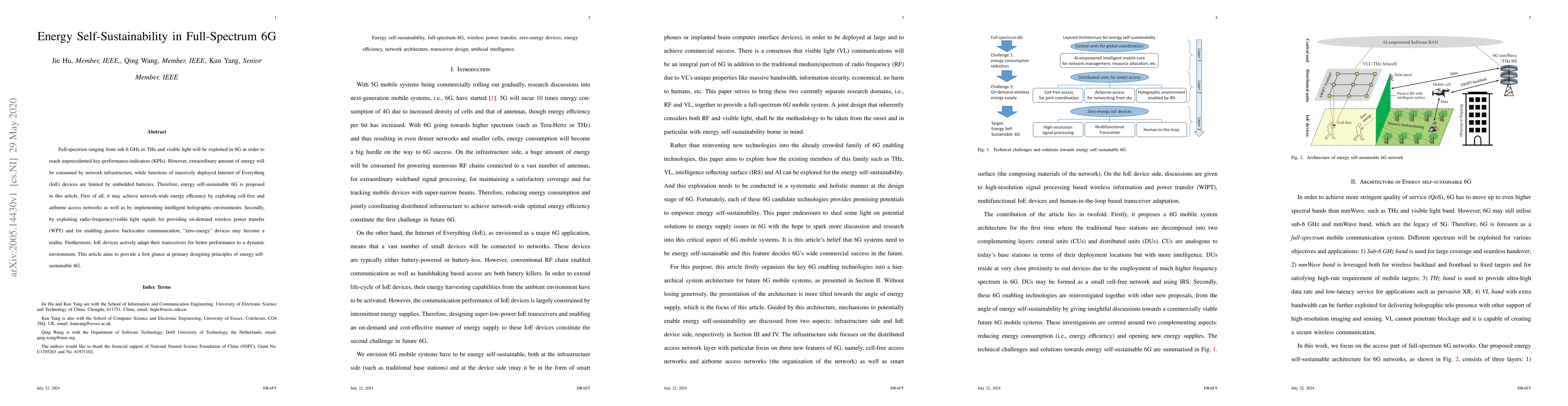 Full-spectrum ranging from sub 6 GHz to THz and visible light will be exploited in 6G in order to reach unprecedented key-performance-indicators (KPIs). However, extraordinary amount of energy will be consumed by network infrastructure, while functions of massively deployed Internet of Everything (IoE) devices are limited by embedded batteries. Therefore, energy self-sustainable 6G is proposed in this article. First of all, it may achieve network-wide energy efficiency by exploiting cell-free and airborne access networks as well as by implementing intelligent holographic environments. Secondly, by exploiting radio-frequency/visible light signals for providing on-demand wireless power transfer (WPT) and for enabling passive backscatter communication, ``zero-energy'' devices may become a reality. Furthermore, IoE devices actively adapt their transceivers for better performance to a dynamic environment. This article aims to provide a first glance at primary designing principles of energy self-sustainable 6G.