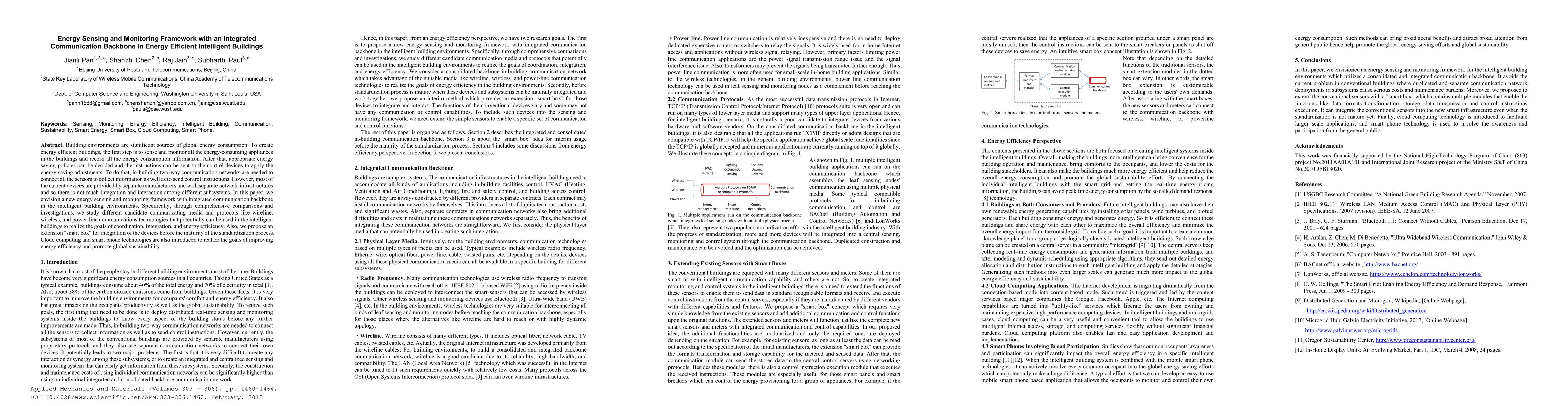 Building environments are significant sources of global energy consumption. To create energy efficient buildings, the first step is to sense and monitor all the energy-consuming appliances in the buildings and record all the energy consumption information. After that, appropriate energy saving policies can be decided and the instructions can be sent to the control devices to apply the energy saving adjustments. To do that, in-building two-way communication networks are needed to connect all the sensors to collect information as well as to send control instructions. However, most of the current devices are provided by separate manufacturers and with separate network infrastructures and so there is not much integration and interaction among different subsystems. In this paper, we envision a new energy sensing and monitoring framework with integrated communication backbone in the intelligent building environments. Specifically, through comprehensive comparisons and investigations, we study different candidate communicating media and protocols like wireline, wireless, and power-line communications technologies that potentially can be used in the intelligent buildings to realize the goals of coordination, integration, and energy efficiency. Also, we propose an extension "smart box" for integration of the devices before the maturity of the standardization process. Cloud computing and smart phone technologies are also introduced to realize the goals of improving energy efficiency and promote global sustainability.