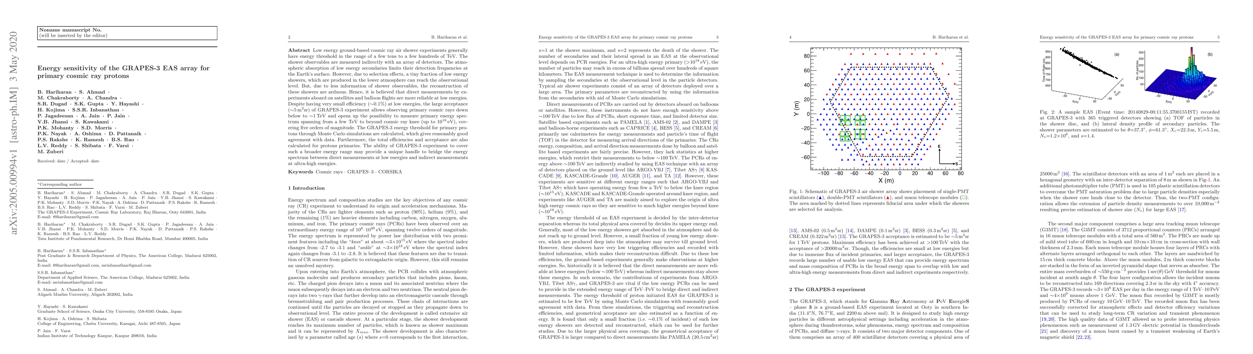 The GRAPES-3 EAS array demonstrates an energy sensitivity that allows it to observe primary cosmic ray protons down to $\sim$1 TeV, despite its low efficiency. This capability enables the experiment to cover a broad energy spectrum from a few TeV to beyond the cosmic ray knee, providing a unique bridge between low-energy direct measurements and ultra-high-energy indirect measurements.